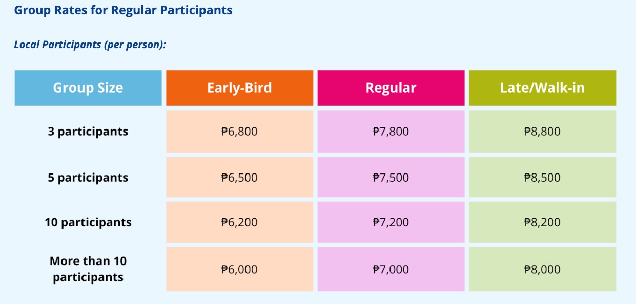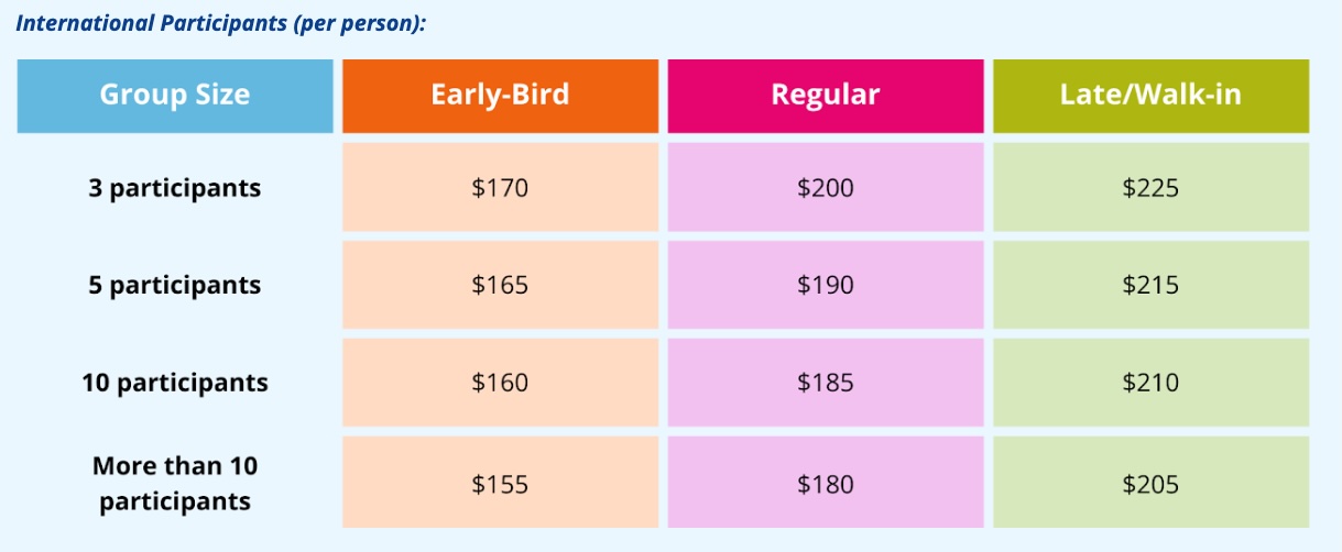 In addition, group registration rates are available for regular participants who wish to register as part of a group. These rates are structured according to the size of the group, with categories for 3 participants, 5 participants, 10 participants, and more than 10 participants.