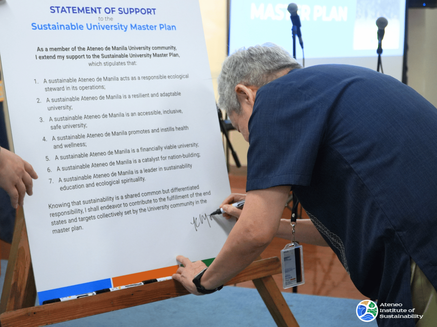 The event was well attended by representatives from different units in the University, including administrators, faculty members, professionals, staff, and students. Messages of Support were also delivered by Dr Benjamin Gerardo T Tolosa, Jr (Vice President for Mission Integration), Dr Maria Luz C Vilches (Vice President for Higher Education), Fr Joaquin Jose Mari C Sumpaico III, SJ (Vice President for Basic Education), Ar Michael M Canlas (Director of Central Facilities Management Office), Hxyll N. Almonguera (IV BS ES, Scholar’s Sector Representative), and Deo Albert M. Serrano (Grade 10 - Sitjar, Head of AJHS Fair Committee). Attendees of the launch also signed a Statement of Support to the Sustainable University Master Plan.