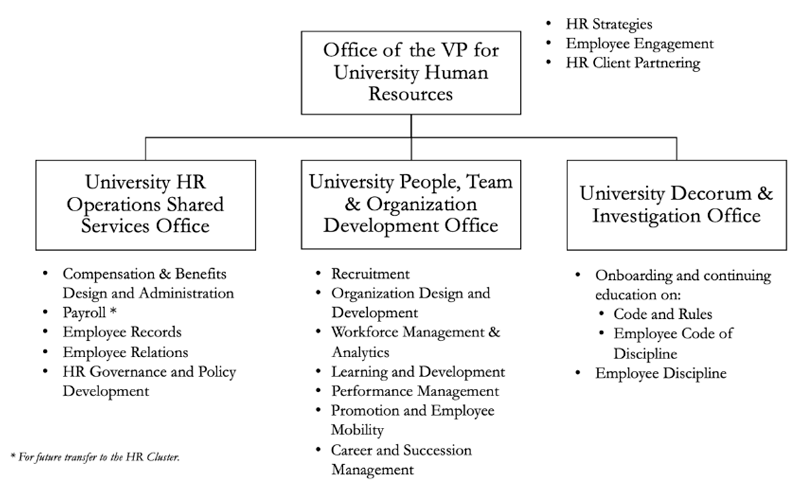 Finally, in this new structure, the Office of the Vice President for University Human Resources (OVP-UHR) will oversee employee engagement and client partnering with the different clusters across the University, on top of spearheading HR strategies.