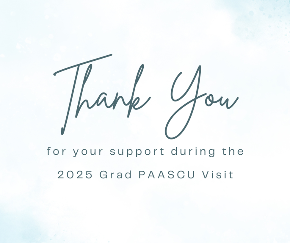 It is with deep appreciation that we express joyful gratitude for the dedication and steadfast support of many in our community during the 2025 Graduate Programs PAASCU Visit. I would like to acknowledge, specifically, an entire cast of characters that propelled the processes from start to finish: the Deans, Chairs, and Program Directors as well as the staff in these offices; the Chairs, Co-Chairs, and Members of the Self-Survey Report Committees; students, faculty, professionals, and administrators who were interviewed; employers, alumni, and community engagement partners who were interviewed/visited by the accreditors; ushers and grad student volunteers who patiently did their tour of duty; the CFMO team; the DITS team; the design team that made the exhibit hall congenial for accreditors to view the items on display and a cozy space for their relaxation and meetings too; the Office of the VP for Mission Integration together with the AVPs under this cluster; the Strategy and Quality Management Office; the team in the Office of the VP for Higher Education; the team in the Office of the Assistant VP for Graduate Education.