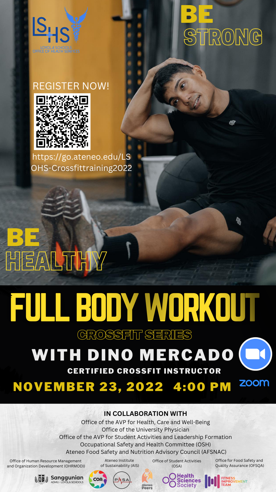 Are you craving for that full body workout experience at home? Join us and satisfy that fitness urge with one of the internationally recognized TOP 15 Filipino Online Trainers, Mr. Derrick Carlo "Dino" Mercado in an online workout session with a live Q&A on November 23, 2022 (Wednesday), 4:00-5:00 pm. You may register through this link:https://go.ateneo.edu/LSOHS-Crossfittraining2022. See you there!