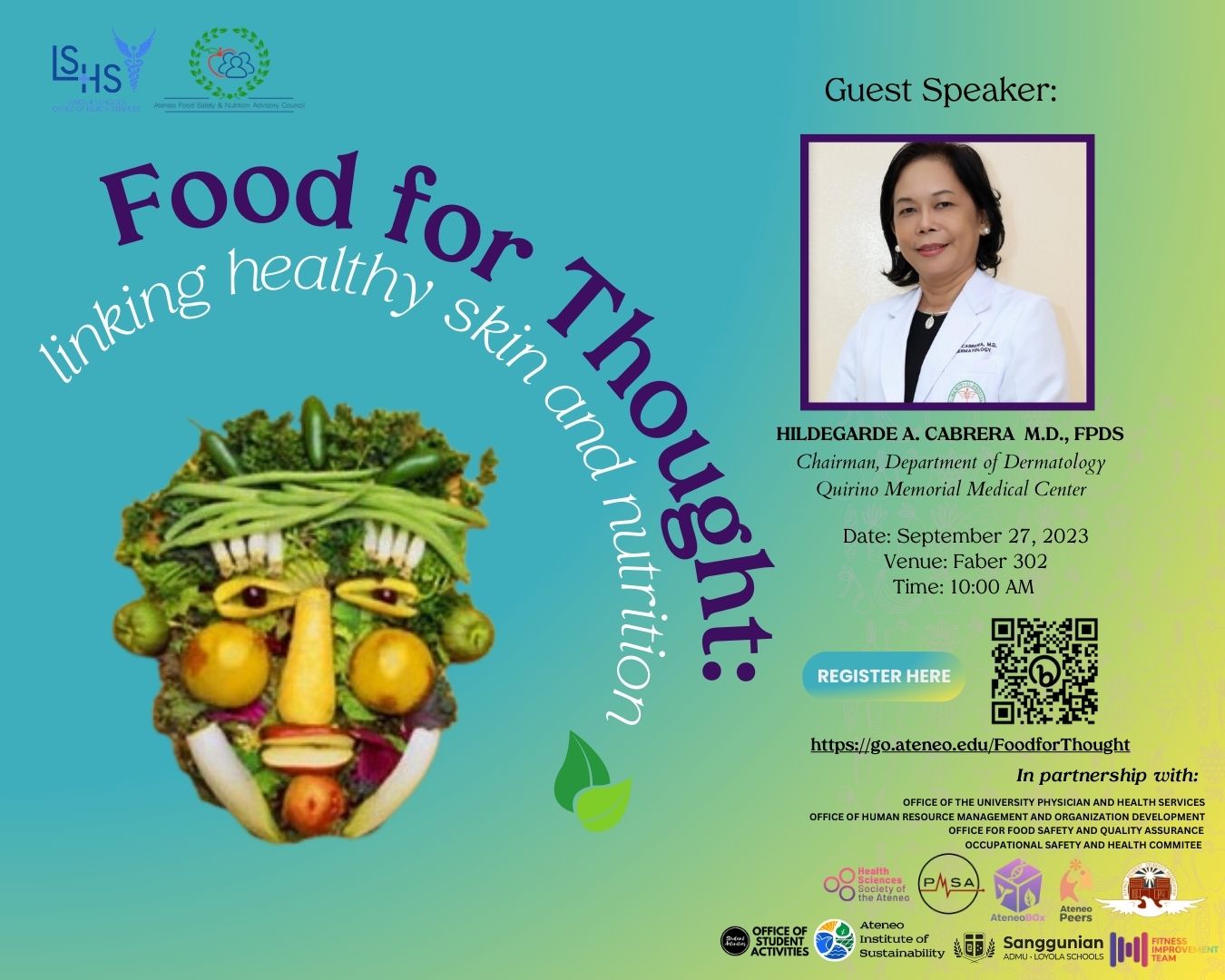 This seminar is part of the Nutrition Month Program: A Road to Fresh Start. It is part of a collaborative program of the Office of the University Physician and Clinic, The Higher Education Office of Health Services-Loyola campus and the Ateneo Food Safety, Occupational Safety and Health Committee (OSH) and Nutrition Advisory Council (AFSNAC), with members from the other units/offices and student organizations namely: Office of Human Resources Management and Organization Development (OHRMOD), Ateneo Institute of Sustainability (AIS), Office for Food Safety and Quality Assurance, Office of Student Activities (OSA), the Sanggunian ng mga Mag-aaral ng Paaralang Loyola ng Ateneo de Manila (SANGGU), Pre-Medical Society of the Ateneo (PMSA), Health Sciences Society of the Ateneo (HSS), Council of Organizations of the Ateneo (COA), Fitness Improvement Team (FIT), Ateneo Resident Students Association (ARSA), Ateneo Biological Association (Ateneo BOX) and Ateneo Peers.