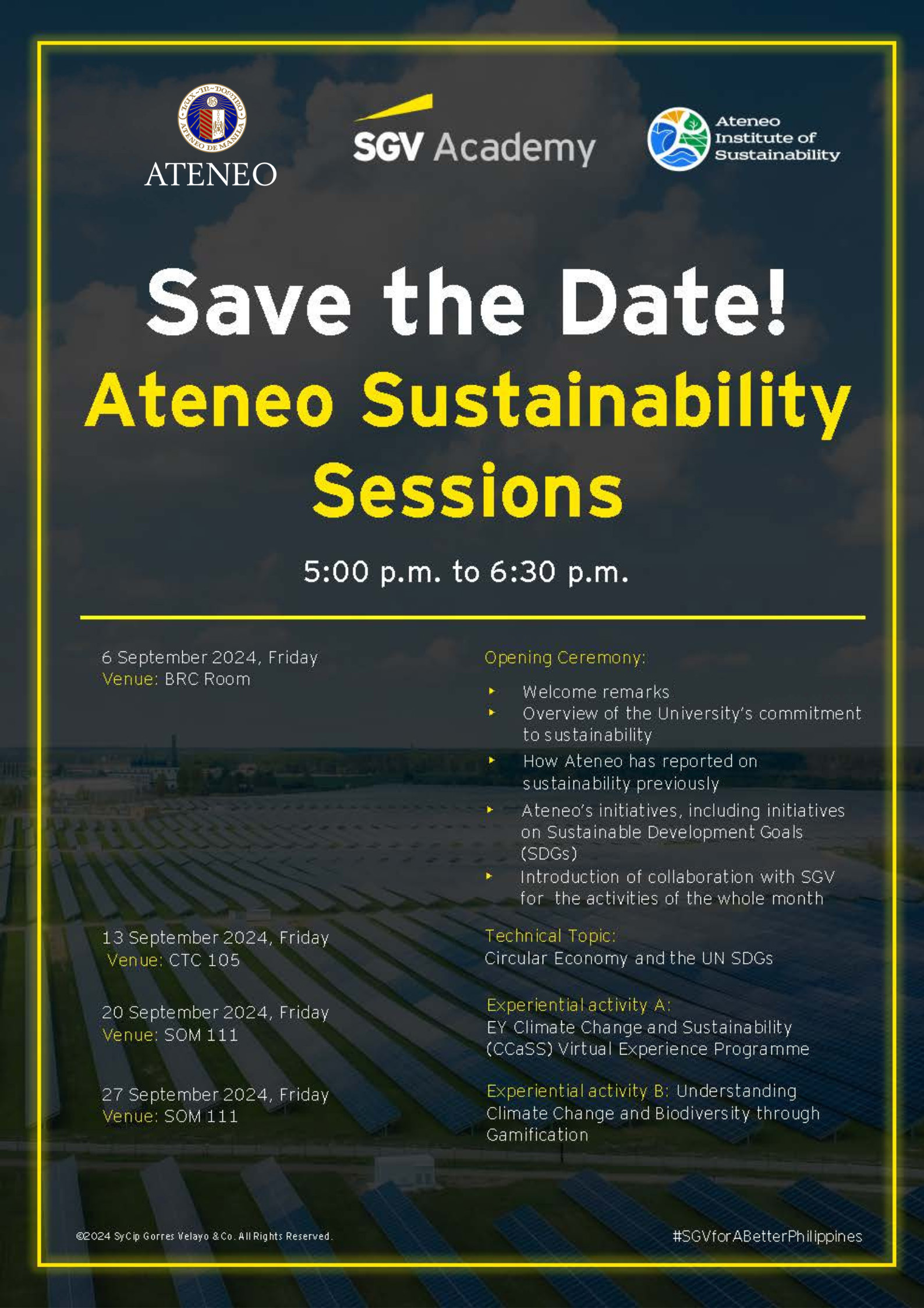 SGV Academy, JGSOM and AIS are jointly organizing the Ateneo Sustainability Sessions this September, the Environmental Awareness Month. The four-session event caters to undergraduate students of Ateneo but is also open to graduate students and other members of the community. Though participants need not attend each session, it will be more meaningful if completed. Sessions will focus on sustainability and sustainability reporting as practiced both in SGV and Ateneo.
