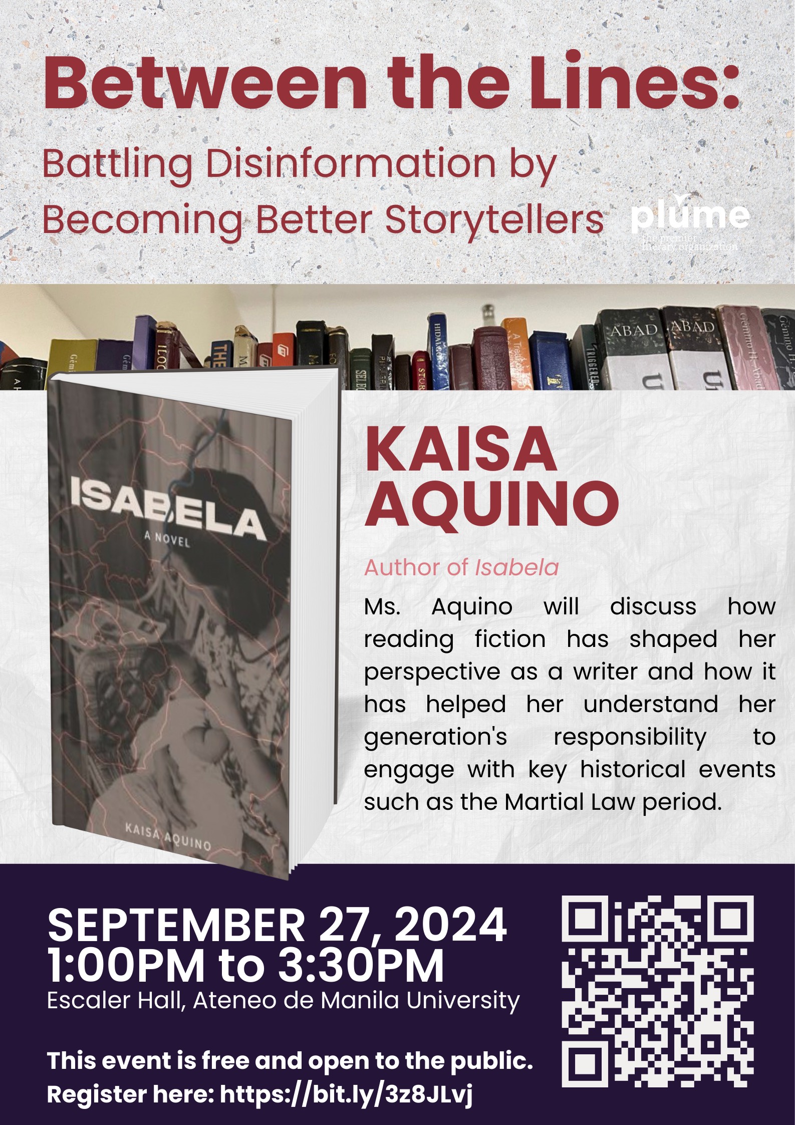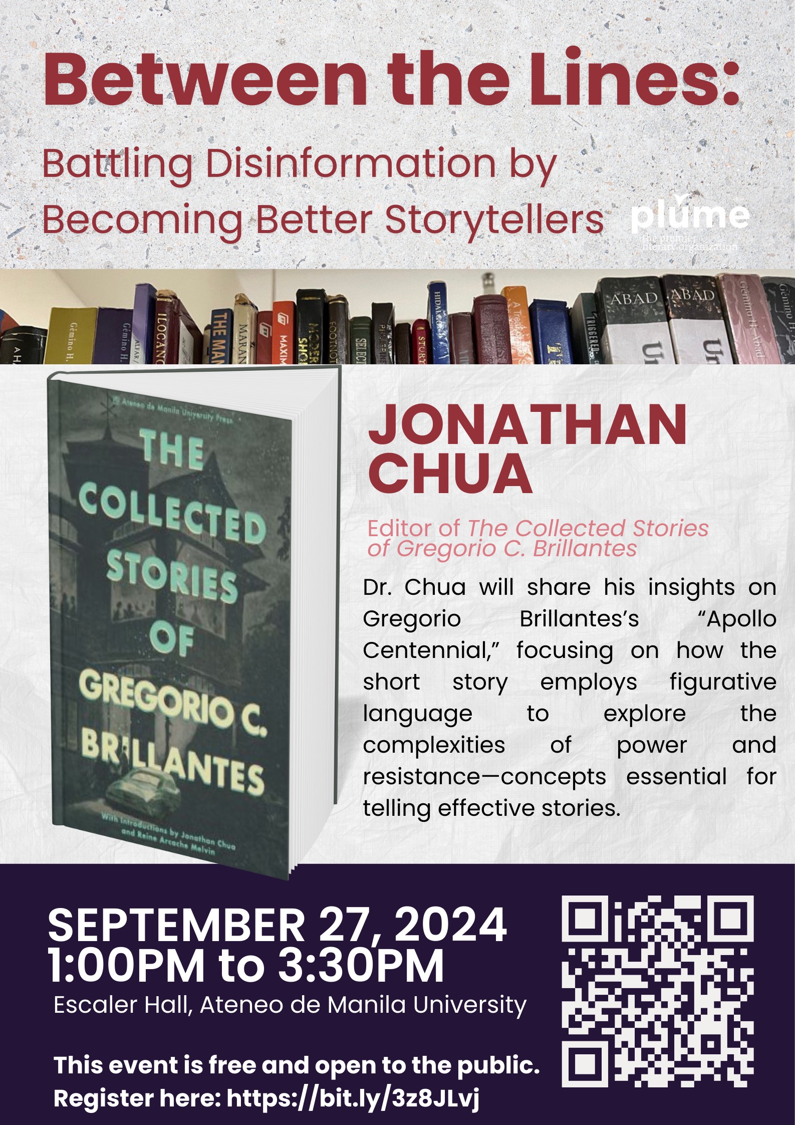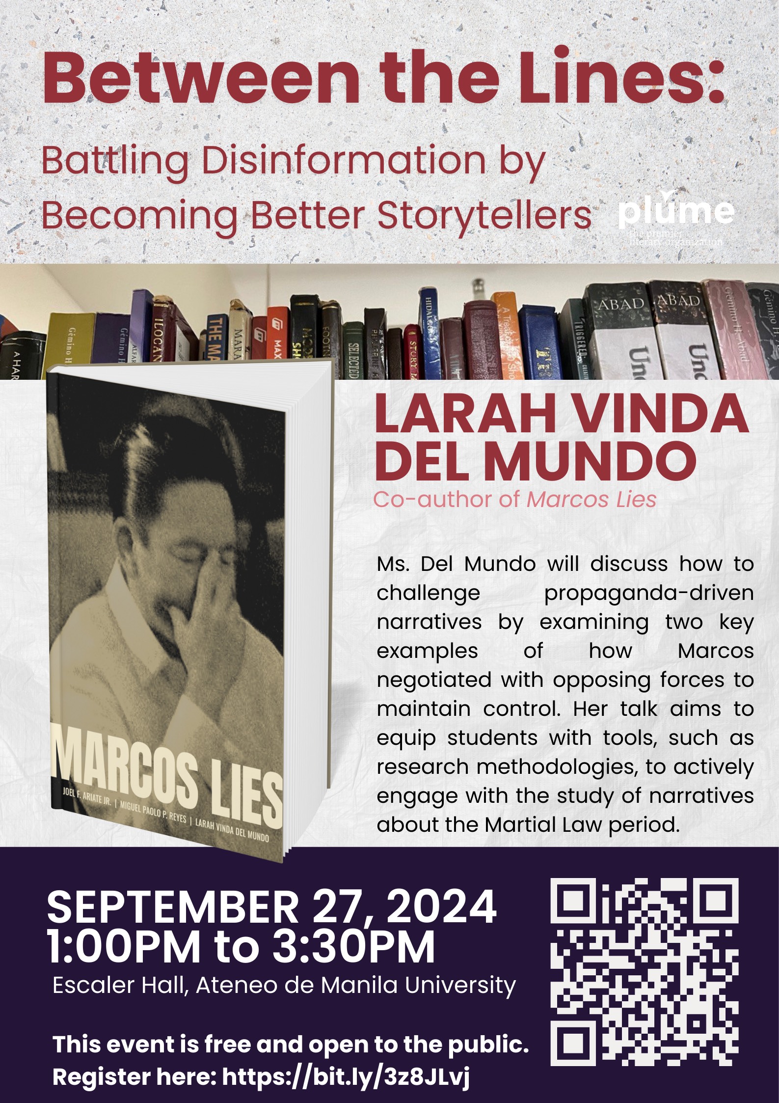 The Literary and Cultural Studies Program and the student organization PLUME will host a talk titled “Between the Lines: Battling Disinformation by Becoming Better Storytellers” at Escaler Hall, Ateneo de Manila University, on 27 September 2024, from 1:00 PM to 3:30 PM.