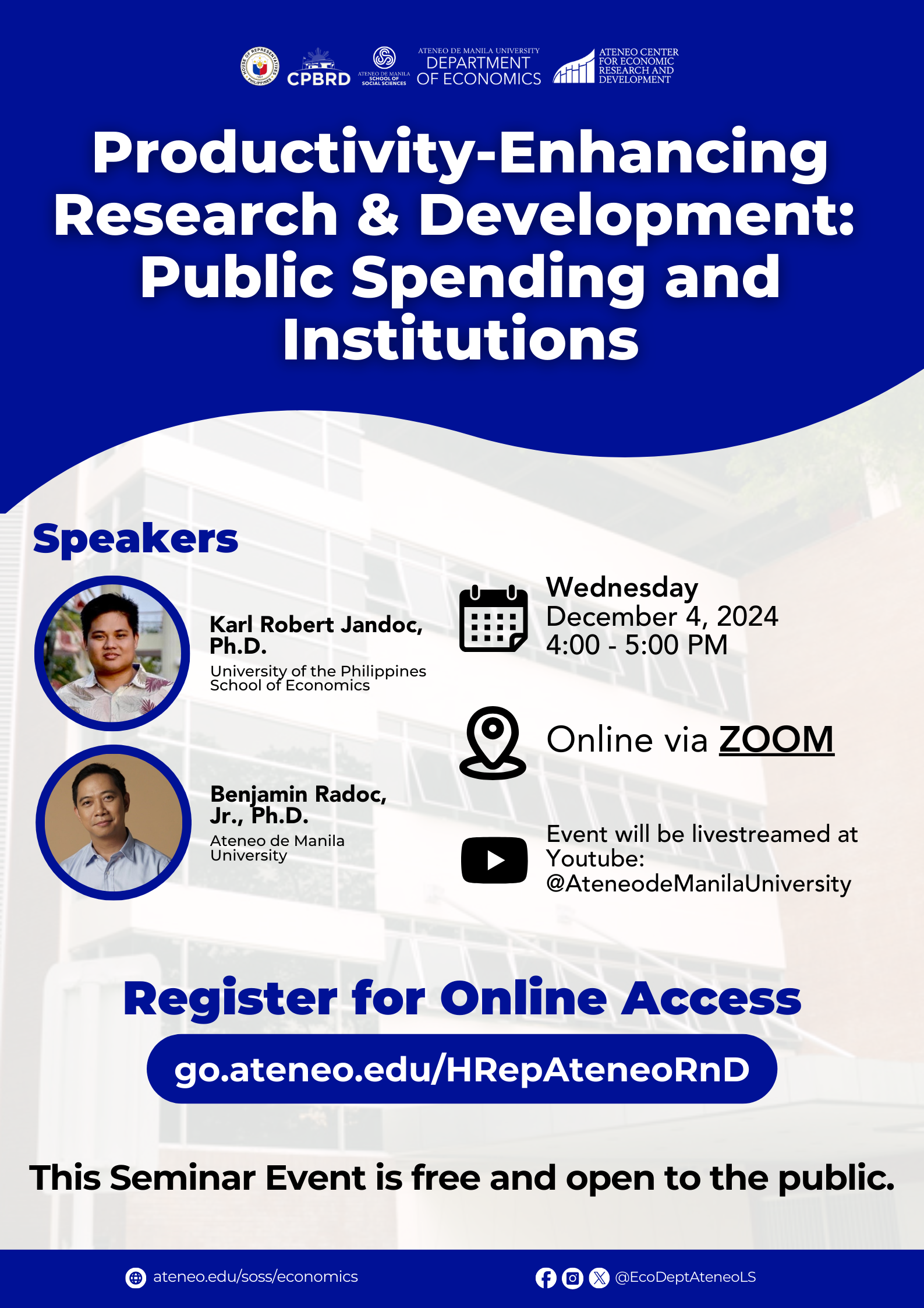 Dr. Benjamin Radoc and Dr. Karl Robert Jandoc bring a wealth of expertise to the discussion on productivity-enhancing research and development. Dr. Radoc, a behavioral economist and Principal Researcher at the Bangko Sentral ng Pilipinas (BSP) Research Academy, specializes in consumer behavior, financial decision-making, and competition policy, with a career spanning roles at the Philippine Competition Commission, Asian Development Bank, and commercial banks. He holds a Ph.D. in Economics from the University of East Anglia and has pursued advanced studies at the Kiel Institute for the World Economy and the University of the Philippines. Dr. Jandoc, an Associate Professor and Research Director at the University of the Philippines School of Economics, focuses on theoretical and applied microeconomics, game theory, environmental and resource economics, and energy economics. A UP Scientist for 2023-2025, he earned his Ph.D. in Economics from the University of Hawai‘i at Manoa and an M.A. in Economics from UPSE. Together, their combined expertise provides a deep understanding of R&D policy, innovation systems, and economic development.