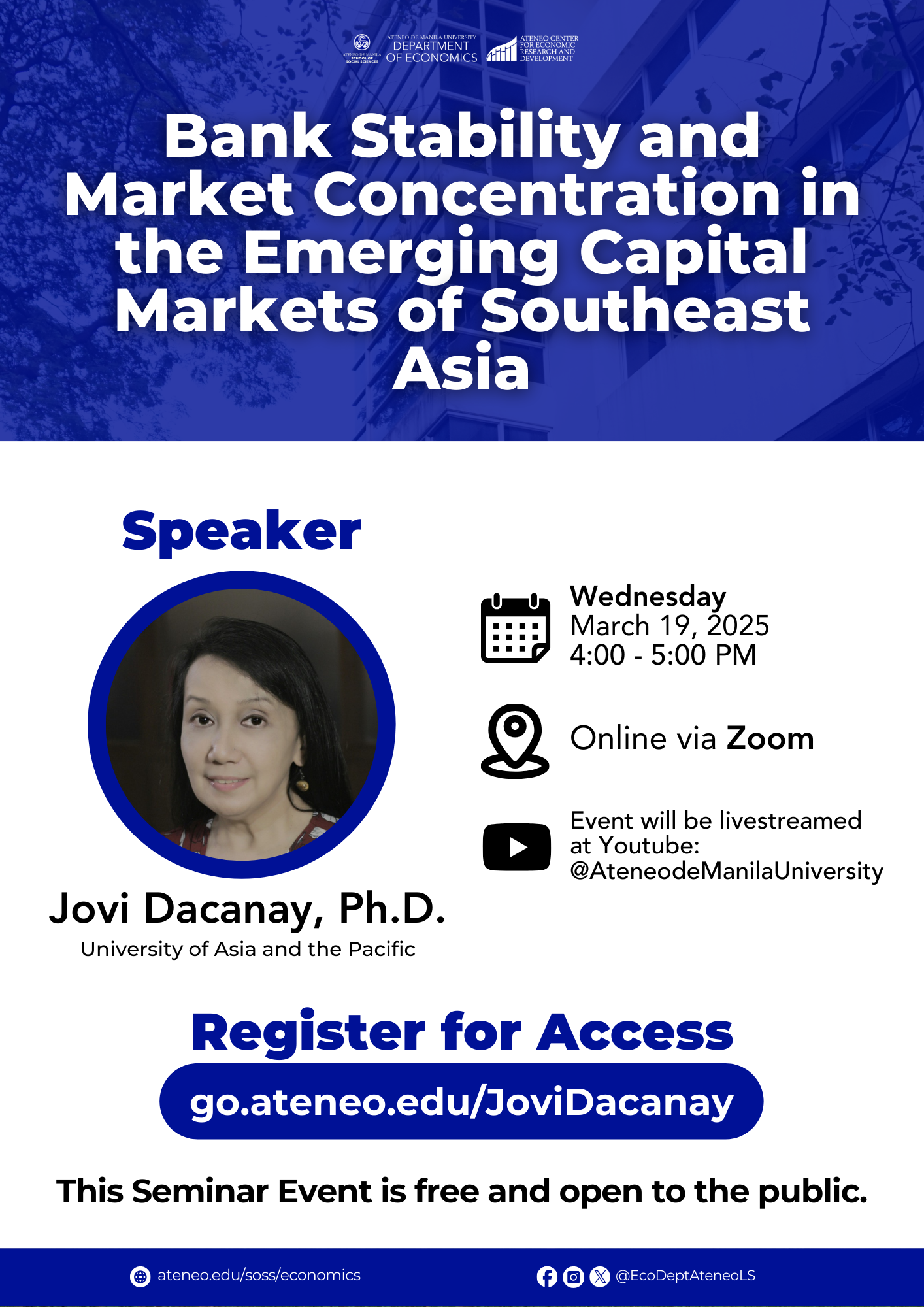 Dr. Jovi Clemente Dacanay is the Program Director of the Ph.D. in Business Economics Program of the UA&P School of Economics. She holds the Professorial Chair for International Migration and OFW Remittances and is currently the Treasurer and a Trustee of the Philippine Social Science Council, and the Philippine Economic Society. She crafted Social Economics, a course using economics and Catholic social thought to propose ethical solutions to socio-economic issues.
