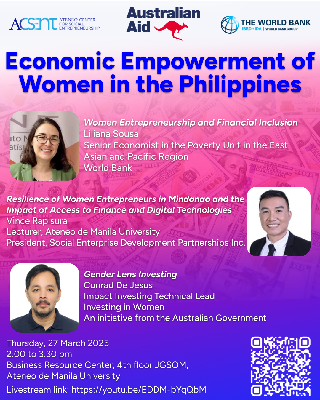 The Ateneo Center for Social Entrepreneurship (ACSEnt), in cooperation with the World Bank and the Australian Embassy to the Philippines, presents "Women Entrepreneurship & Financial Inclusion." Join us on Thursday, 27 March 2025 from 2:00 to 3:30 pm at the Ateneo Business Resource Center, as we look into the state of financial inclusivity for women entrepreneurs in the country.