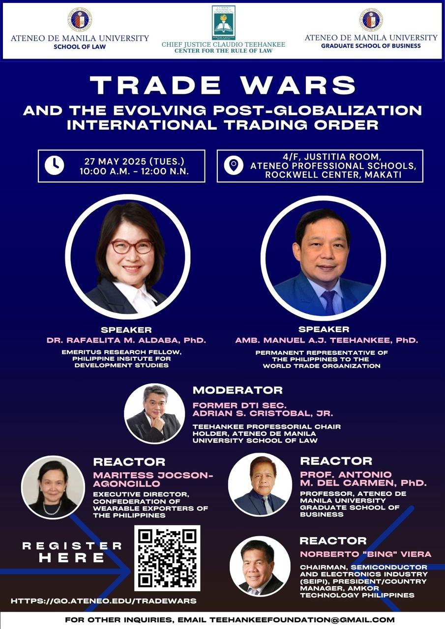 Join us for a timely and insightful forum on the global economic landscape, organized by the Ateneo Law School, Ateneo Graduate School of Business, and the Chief Justice Claudio Teehankee Center for the Rule of Law.