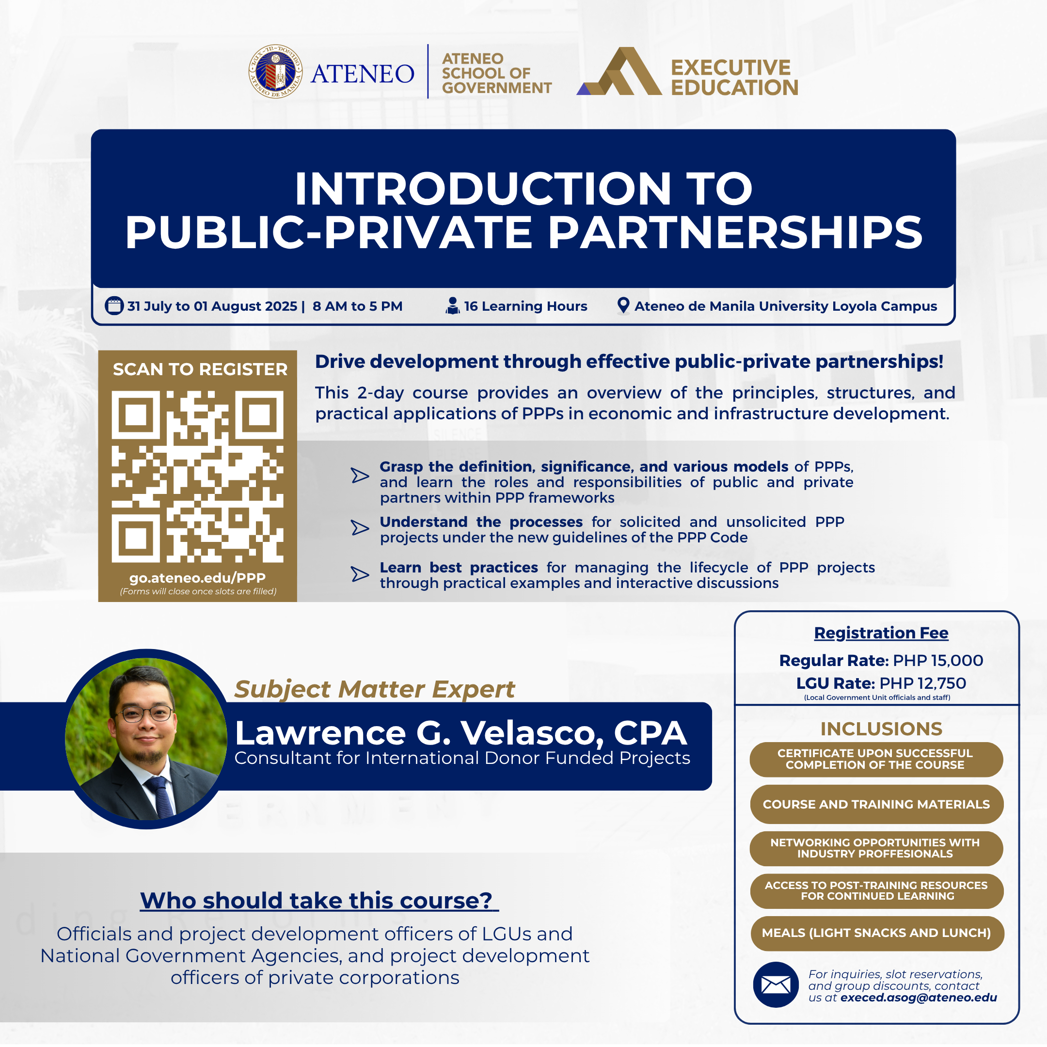 The Ateneo School of Government through its Executive Education Program invites you to the training course on Introduction to Public-Private Partnerships scheduled on July 31 to August 1 at Ateneo de Manila University Loyola Campus.