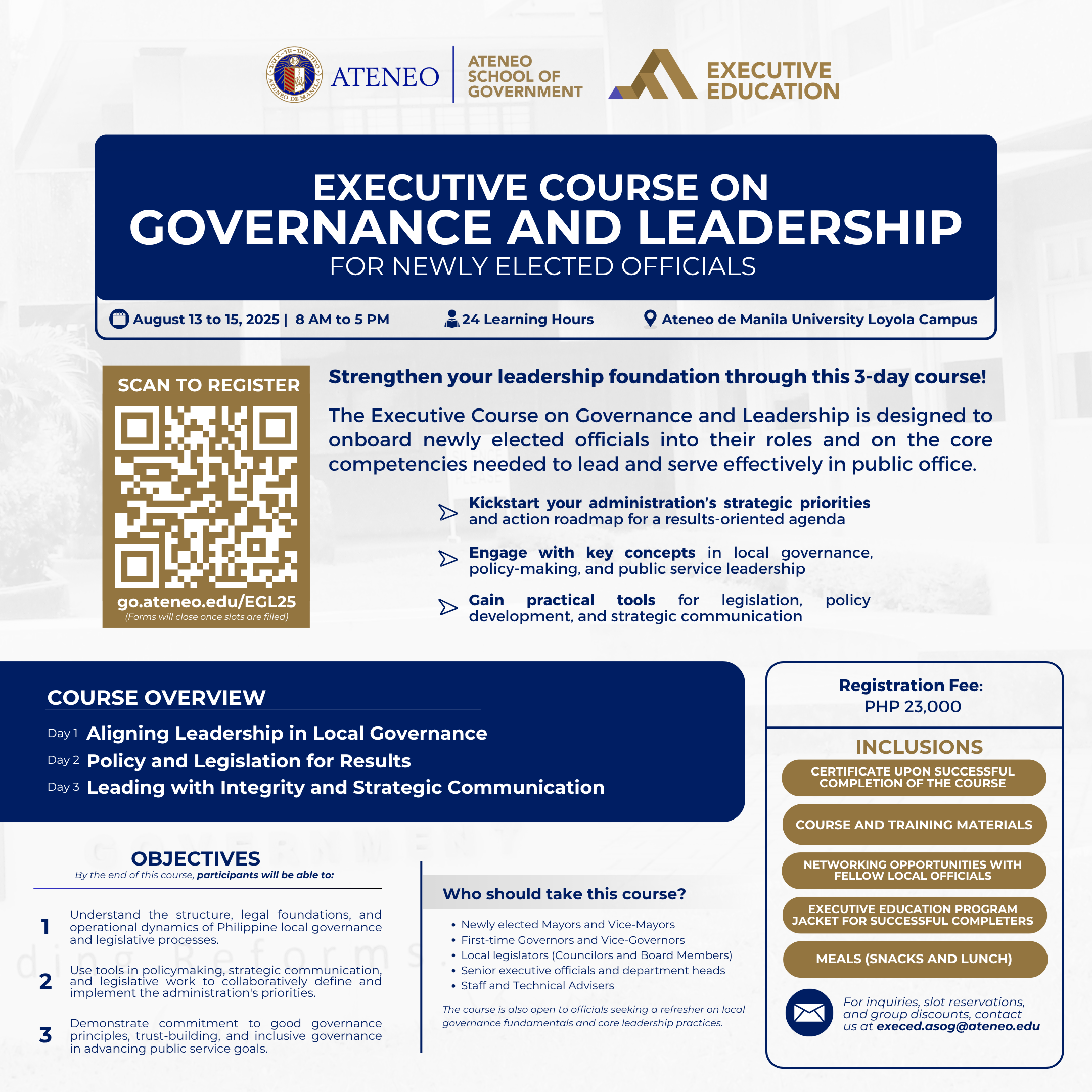 We are pleased to invite you to our Executive Course on Governance and Leadership, this 13 to 15 August from 8 AM to 5 PM at the Ateneo de Manila University Loyola Campus. This course is designed to onboard newly elected officials into their roles and on the core competencies needed to lead and serve effectively in public office.