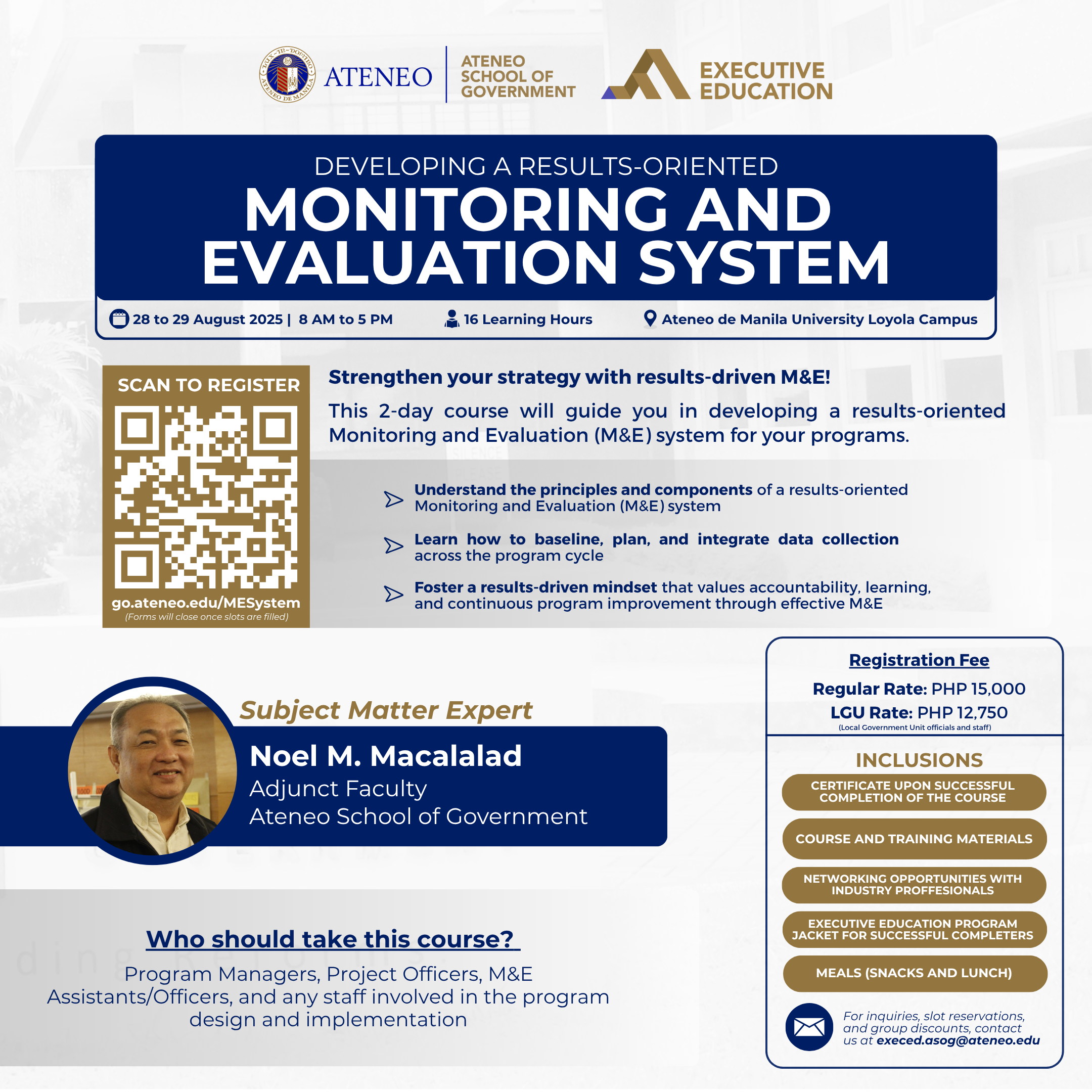 The Ateneo School of Government through its Executive Education Program invites you to the training course on Developing a Results-Oriented Monitoring and Evaluation System scheduled on 28 to 29 August 2025 at Ateneo de Manila University Loyola Campus.