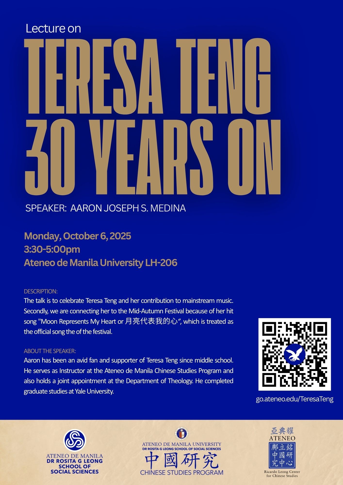 Aaron has been an avid fan and supporter of Teresa Teng since middle school. He serves as Instructor at the Ateneo de Manila Chinese Studies Program and also holds a joint appointment at the Department of Theology. He completed graduate studies at Yale University.