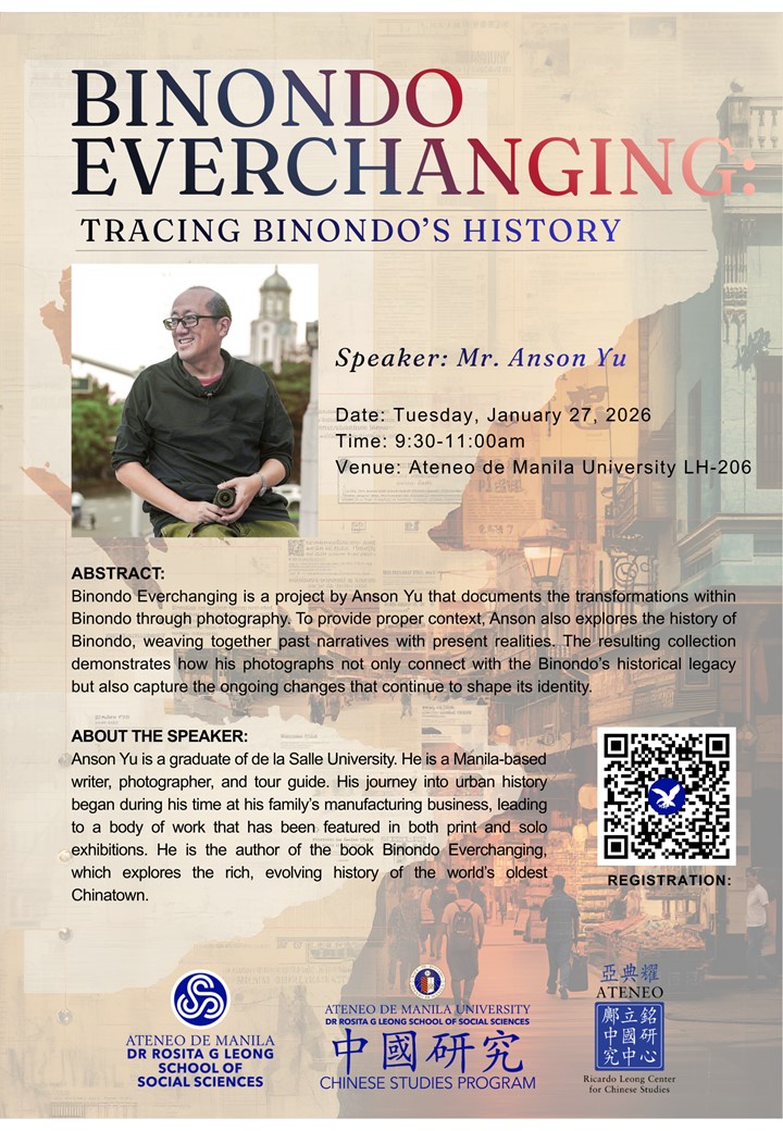 Anson Yu is a graduate of de la Salle University. He is a Manila-basedwriter, photographer, and tour guide. His journey into urban history began during his time at his family’s manufacturing business, leading to a body of work that has been featured in both print and solo exhibitions. He is the author of the book Binondo Everchanging, which explores the rich, evolving history of the world’s oldest Chinatown.