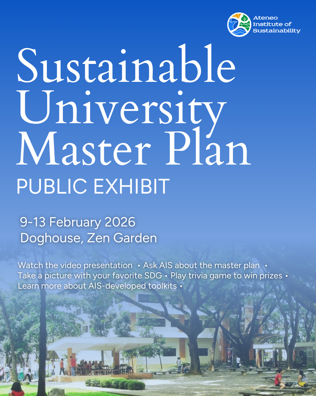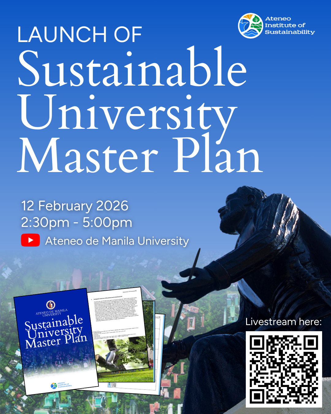 The Ateneo Institute of Sustainability (AIS) cordially invites the Ateneo de Manila community to watch the livestreaming of the Launch of the Sustainable University Master Plan on 12 February 2026 (Thursday), 2:30-5:00pm via Ateneo de Manila University YouTube channel. The launch will recap the journey of the collective reimagination of what a sustainable University is for Ateneo de Manila.