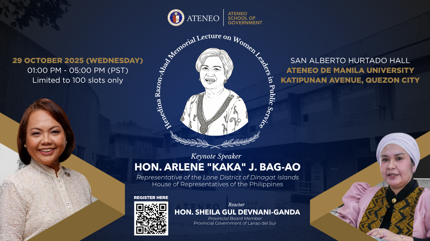 Organized by the Ateneo School of Government, the lecture aims to honor the legacy of Henedina “Dina” Razon-Abad, the founding Dean of the Ateneo School of Government. Lone District of Dinagat Islands Representative Hon. Arlene "Kaka" J. Bag-ao will be serving as the keynote speaker of this inaugural lecture, to be followed by the observation and reaction of Lanao del Sur Provincial Board Member Hon. Sheila Gul Devnani-Ganda.