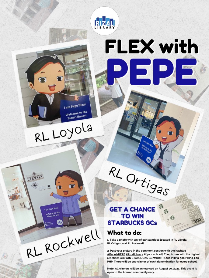 2. Post your picture in the comment section with the hashtag #PepeIsHERE #RizalLibrary #[your school]. The picture with the highest reactions will WIN STARBUCKS GC WORTH 1000 PHP & 500 PHP & 200 PHP. There will be one winner of each denomination for every school.