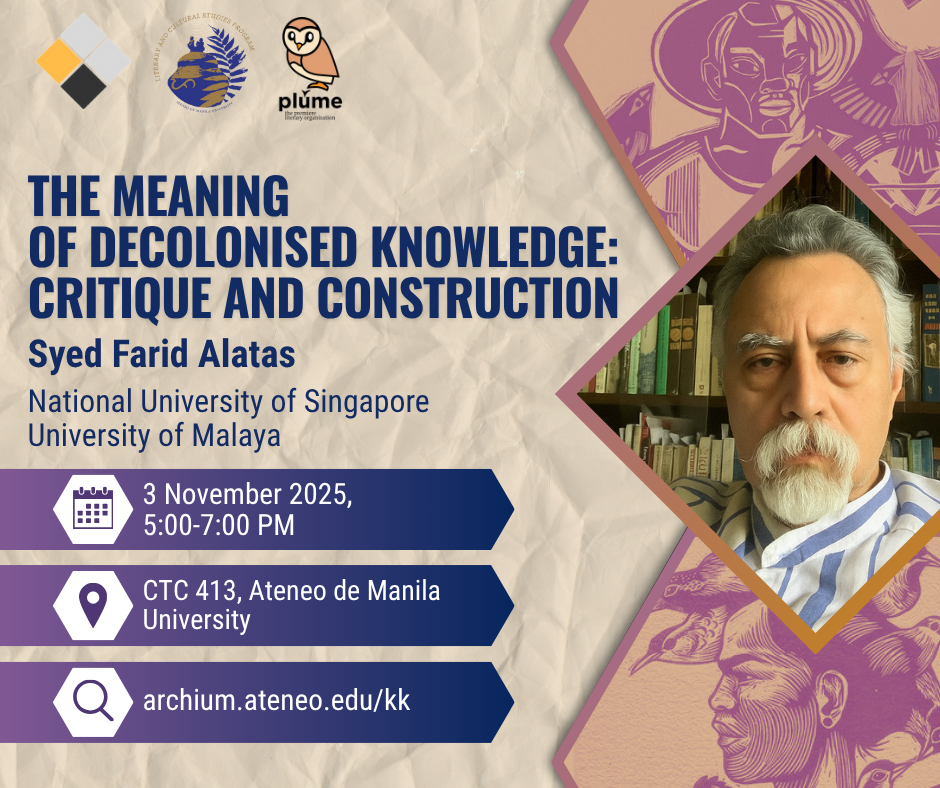 Kritika Kultura, in collaboration with the Literary and Cultural Studies Program and PLUME, invites you to a lecture titled “The Meaning of Decolonised Knowledge: Critique and Construction,” to be delivered by Syed Farid Alatas of the National University of Singapore and University of Malaya. The event will take place on 3 November 2025, 5:00–7:00 PM, at CTC 413, Ateneo de Manila University.