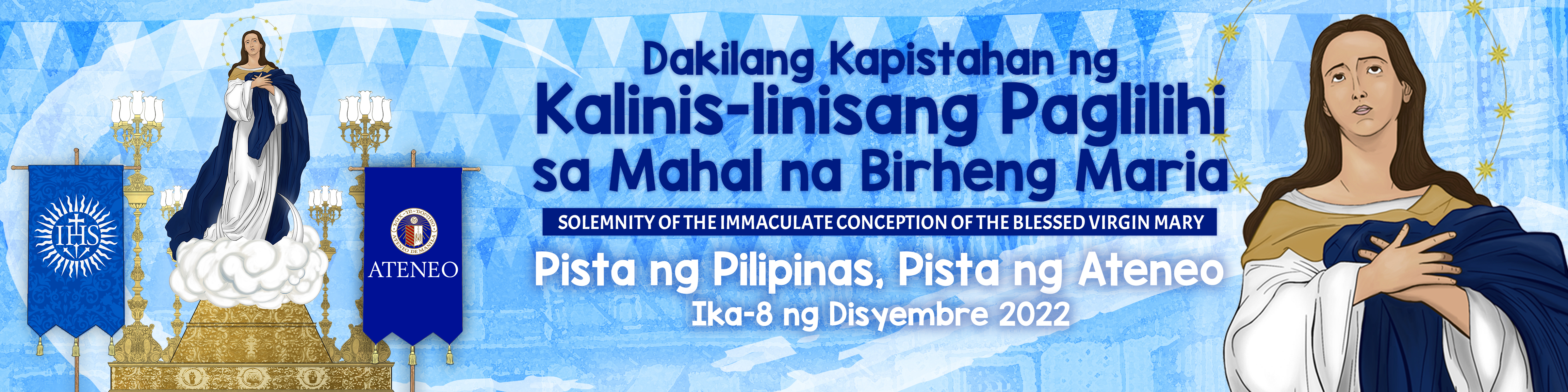 We celebrate the high feast of the Immaculate Conception of the Blessed Virgin Mary every December 8. We mark the day of the beginning of the life of Mama Mary in the womb of her mother, Saint Anne, nine months before her birthday on September 8th. This feast celebrates how God chose and prepared Mary to be the Mother of Jesus even before she was born. She was conceived without the stain of sin by virtue of the sacrifice of the Son she was to carry. It was so that her Son would not inherit original sin, and being sinless, he could offer himself for the sins of all humanity. The feast reminds us that if God can preserve Mary from original sin by the offering of Jesus, then all of us can be cleansed from our sins by the same offering. Therefore, we can also come to the fullness of redemption and the glory of heaven like our Mother. Mary, the Immaculate Conception, is the patroness of the Philippines. When the Spaniards came to the Philippines in the 16th century, the first missionaries built the first church in Manila under the title of the Conception of the Blessed Virgin Mary. It is now the Manila Cathedral, the mother church of all the churches in the Philippines. When the Jesuits returned in the 19th century, they built their house near the cathedral, took over the administration of a school called the Ateneo, and put it under the patronage of Mary conceived without sin. In the Jesuit records, the Ateneo de Manila University is the College of the Immaculate Conception. This is why our school colors are blue and white and, in our graduation hymn, we sing "Mary for you, for your white and blue, we pray you'll keep us, Mary, constantly true! We pray you'll keep us, Mary, faithful to you!"
