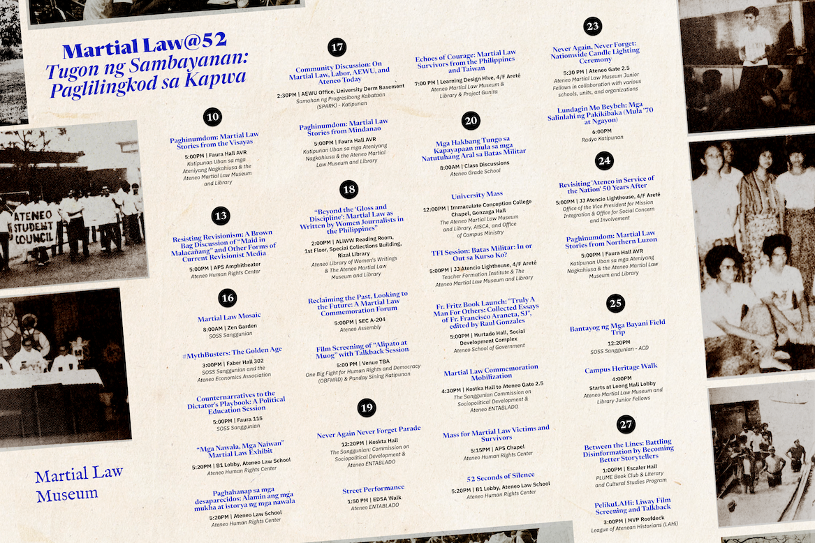 As we commemorate the 52nd Anniversary of the Declaration of Martial Law in the Philippines, the Office of the Vice President for Mission Integration (OVPMI), the Ateneo Martial Law Museum and Library (AMLML), and the various schools, departments, offices, and student organizations of the Ateneo de Manila University invite you to a series of events that reflect our shared history and recall the sacrifices of those who fought for justice and peace.