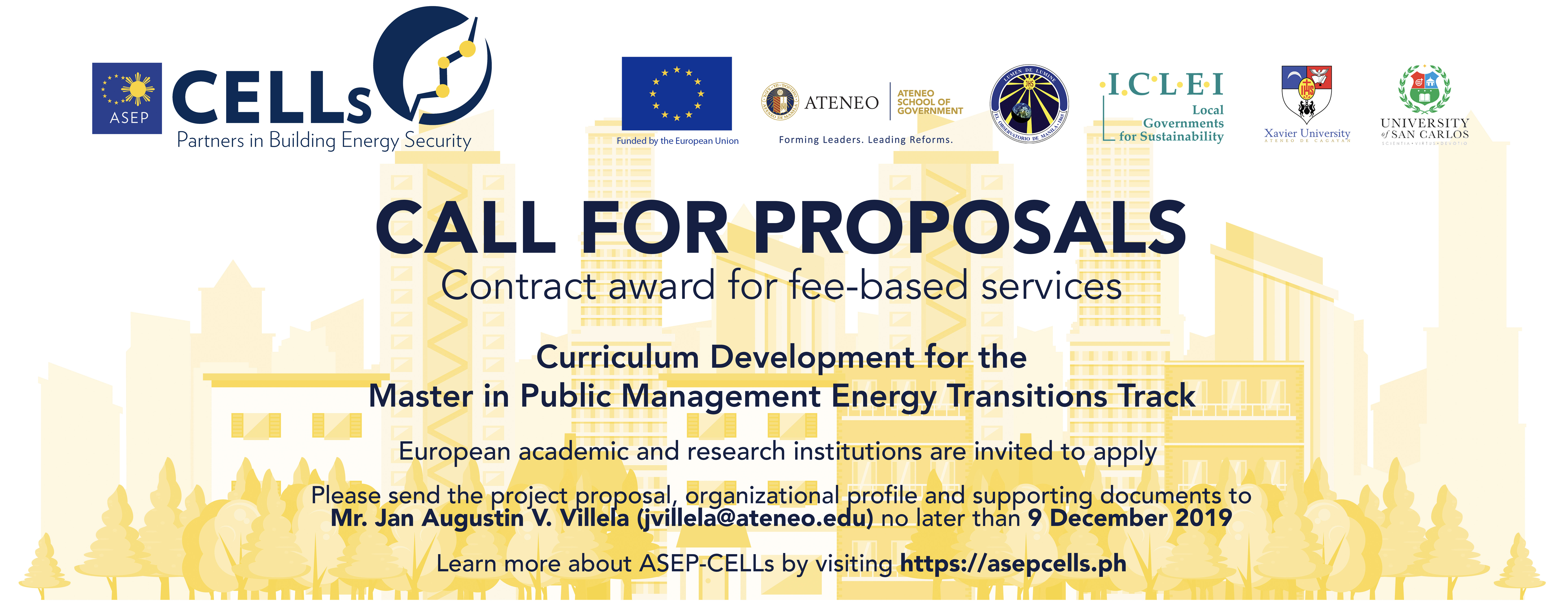 The project concept note must be submitted by 9 December 2019 to Mr. Jan Augustin V. Villela (jvillela@ateneo.edu). For inquiries and additional information related to the request, you may contact the EU CELLs Project Management Office through (02) 8426 6001 ext. 4640.