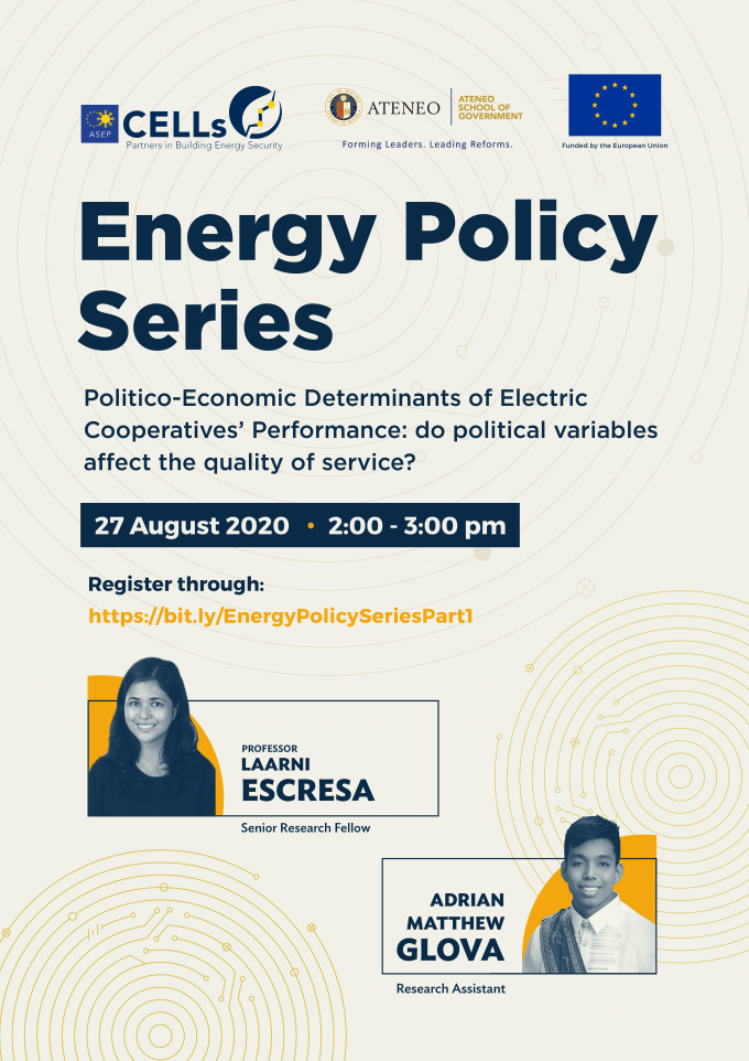 Join Dr. Laarni Escresa, Senior Research Fellow, and Mr. Adrian Matthew Glova, Research Assistant, as they present their study, “Politico-Economic Determinants of Electric Cooperatives’ Performance: do political variables affect the quality of service?” this 27 August 2020, Thursday from 2:00-3:00 pm.