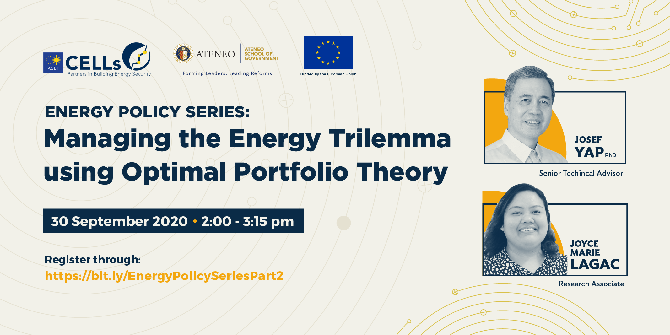 In this next round, Ateneo School of Government presents the study, “Managing the Energy Trilemma using Optimal Portfolio Theory” produced by Joyce Marie P. Lagac, Research Associate, and Dr. Josef Yap, Senior Technical Advisor from the ASEP CELLs Project funded by the European Union.