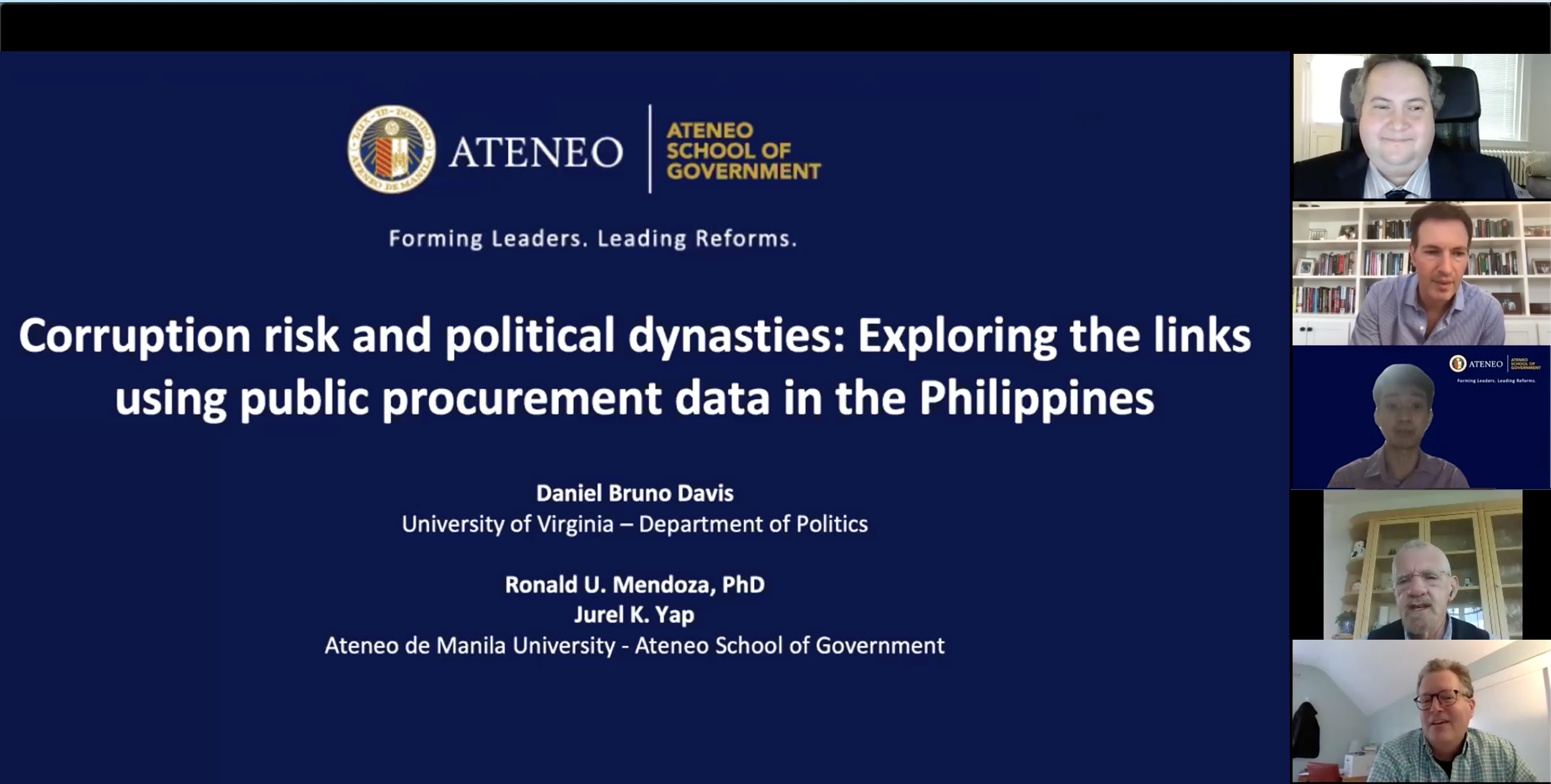 The Ateneo School of Government (ASOG), through the Ateneo Policy Center (APC), presented their study entitled ‘Corruption risk and political dynasties: Exploring the links using public procurement data in the Philippines’. Highly distinguished professors from the University of Virginia’s Quantitative Collaborative group attended the talk held via Zoom.
