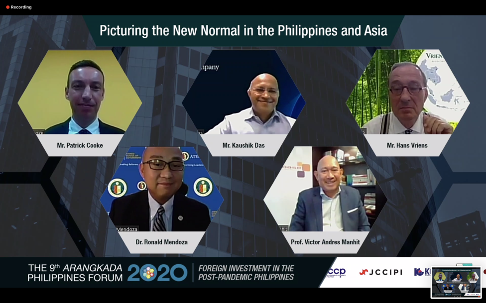 On December 1, 2020, the 9th Arangkada Philippines Forum was held via zoom application with the theme entitled, “Foreign Investment in the Post-Pandemic Philippines”. Ateneo School of Government Dean Ronald U. Mendoza, together with Mr. Kaushik Das, Mr. Hans Vriens, and Prof. Victor Andres Manhit, were invited as panelists in the morning session centered on the theme:, “Picturing the New Normal in the Philippines and Asia”.