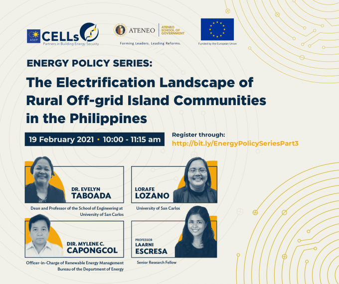 We will feature the work of our partners from the University of San Carlos (USC), titled "The Electrification Landscape of Rural Off-grid Island Communities in the Philippines” by Dr. Evelyn Taboada, Dean and Professor of the School of Engineering, and Ms. Lorafe Lozano, School of Engineering Faculty. We will also be joined by Director Mylene Caponcol, Officer-in-Charge of the Renewable Energy Management Bureau of the Department of Energy, and Dr. Laarni Escresa, ASEP CELLs Senior Researcher.