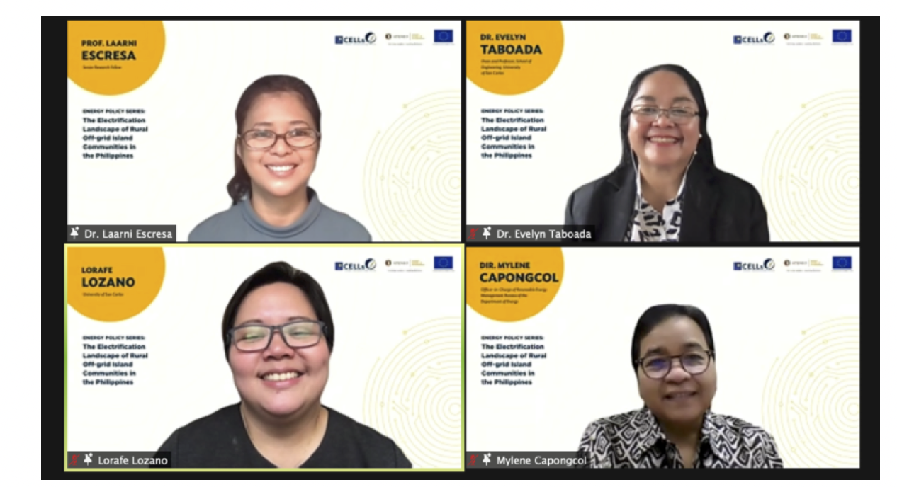 The study entitled, “Demystifying the Authentic Attributes of Electricity-Poor Populations: The Electrification Landscape of Rural Off-Grid Island Communities in the Philippines” was presented by Professor Lorafe Lozano, and Dean Evelyn Taboada, Ph.D. from the School of Engineering at the University of San Carlos. Dean Taboada serves as the Project lead of the EU-ASEP Visayas CELL, while Professor Lozano is also a part of the faculty research team working on the project. Completing the list of the panelists include Director Mylene Capongcol, the Officer-in-charge of the Renewable Energy Management Bureau at the Department Energy as the reactor, while Dr. Laarni Escresa, ASEP CELLs Senior Research Fellow moderated the open forum.