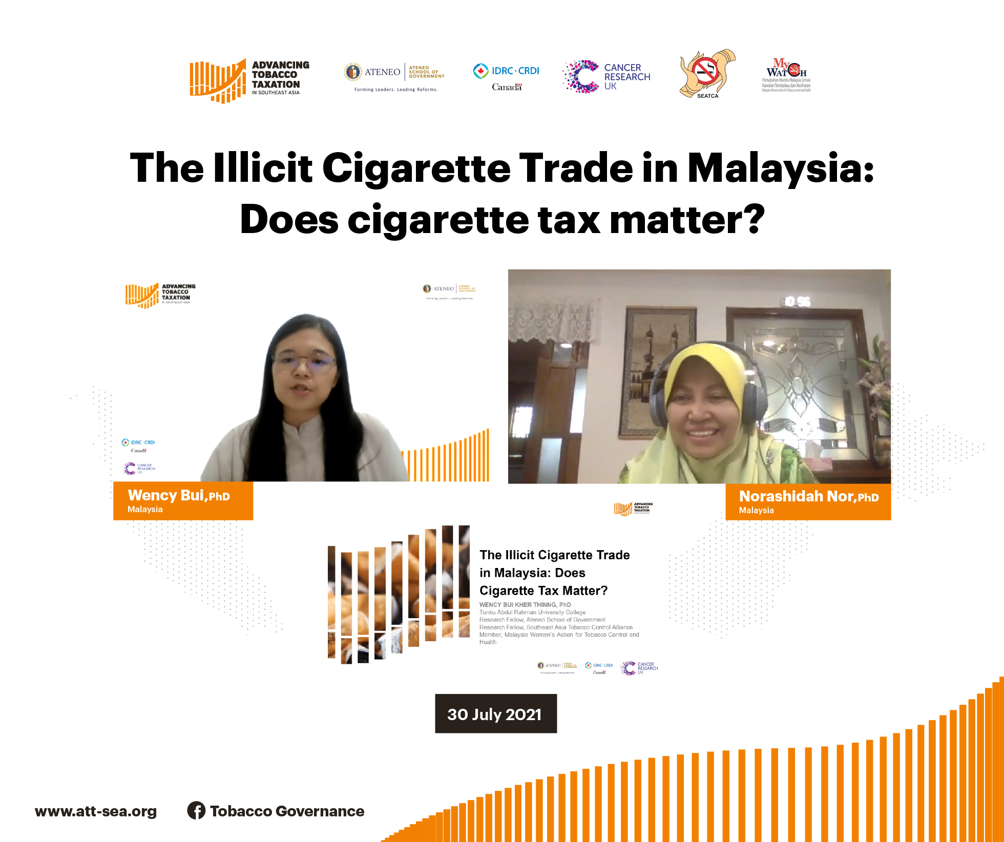 On July 30, 2021, The Ateneo School of Government through its project Advancing Tobacco Taxation in Southeast Asia (ATTSEA), funded by the International Development Research Centre (IDRC), spearheaded a webinar entitled “The Illicit Cigarette Trade in Malaysia: Does Cigarette Tax Matter?,” authored and presented by its Research Fellow, Wency Bui, PhD. The online event was attended by various stakeholders, including members of the Malaysian Council for Tobacco Control, Stopping Tobacco Organization and Products, Southeast Asian Tobacco Control Alliance, and representatives from Malaysian Government agencies, namely Ministry of Health, Ministry of Finance, and the Royal Malaysian Customs Department.