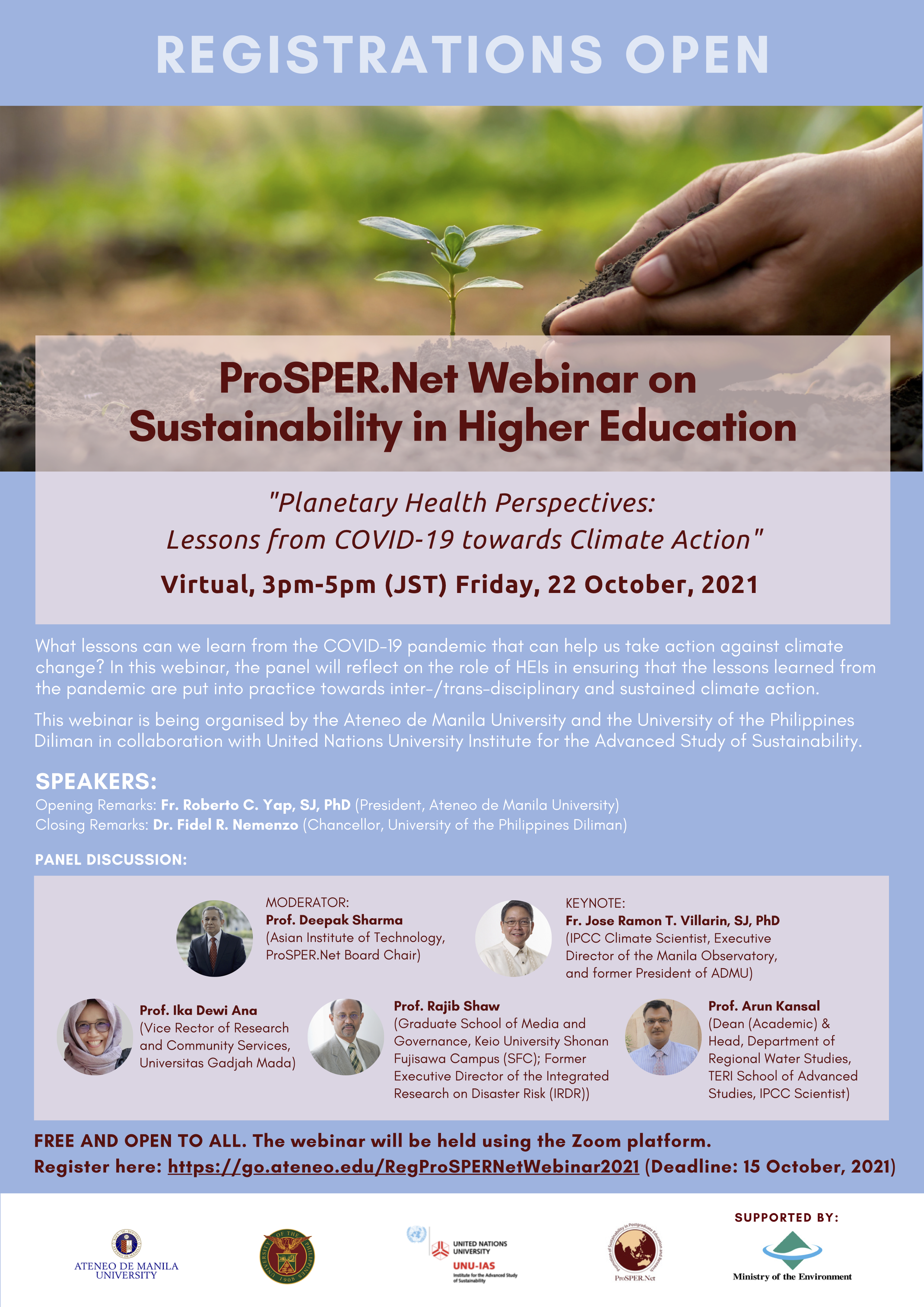 The United Nations University Institute for the Advanced Study of Sustainability will organise a ProSPER.Net Webinar on Sustainability in Higher Education, ‘Planetary Health Perspectives: Lessons from COVID-19 towards Climate Action’ from 15:00 – 17:00 JST on 22 October 2021.