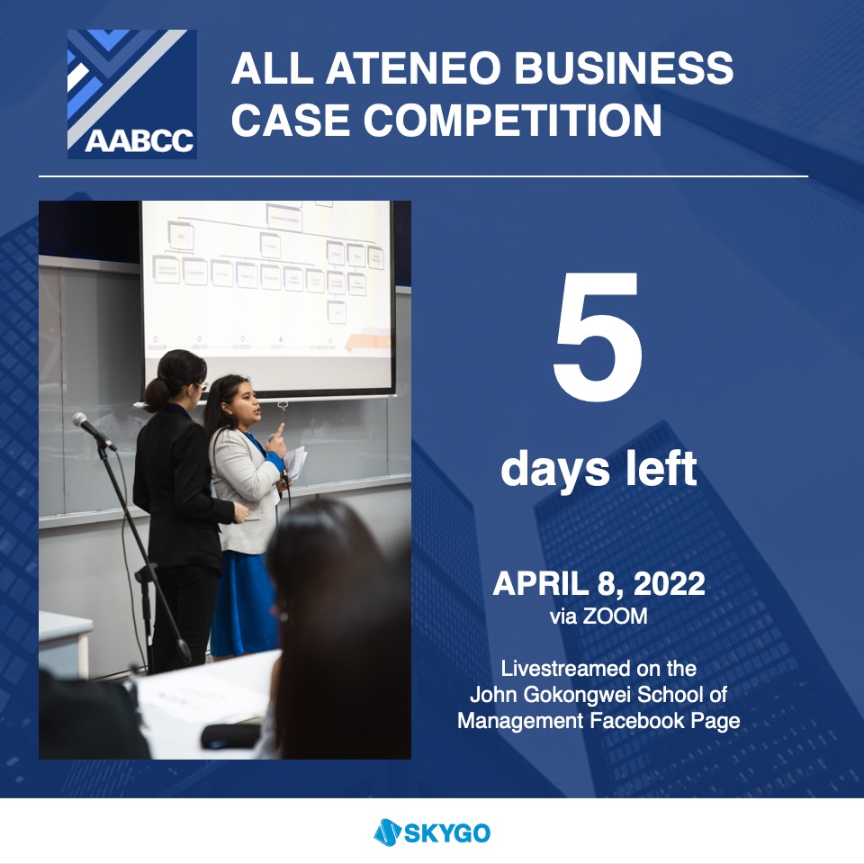 Established in 2019, the All-Ateneo Business Case Competition (AABCC) is a competition challenging students from the five Jesuit universities to exercise their analysis and presentation skills in solving a business problem. The third launch of the event—and the first to be organized fully online—will be on April 8, 2022, from 1:45 PM to 7:00 PM and live-streamed through the John Gokongwei School of Management Facebook page.