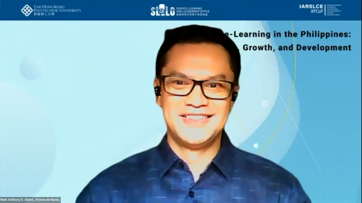 Dr. Mark Anthony D. Abenir, Associate Professor of the Loyola Schools’ Development Studies Program spoke about “Service-Learning in the Philippines: Origins, Growth, and Development” at a webinar last February 24, 2023 which was hosted by the International Association for Research on Service-Learning and Community Engagement Asia-Pacific Community of Practice (IARSLCE APCoP), with the help of the Service-Learning and Leadership Office (SLLO) of the Hong Kong Polytechnic University (PolyU).