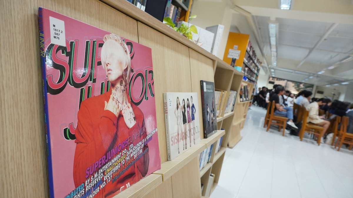 Meanwhile, additional shelves around the nook feature copies of books and other media on Korean music, cinema, and pop culture.