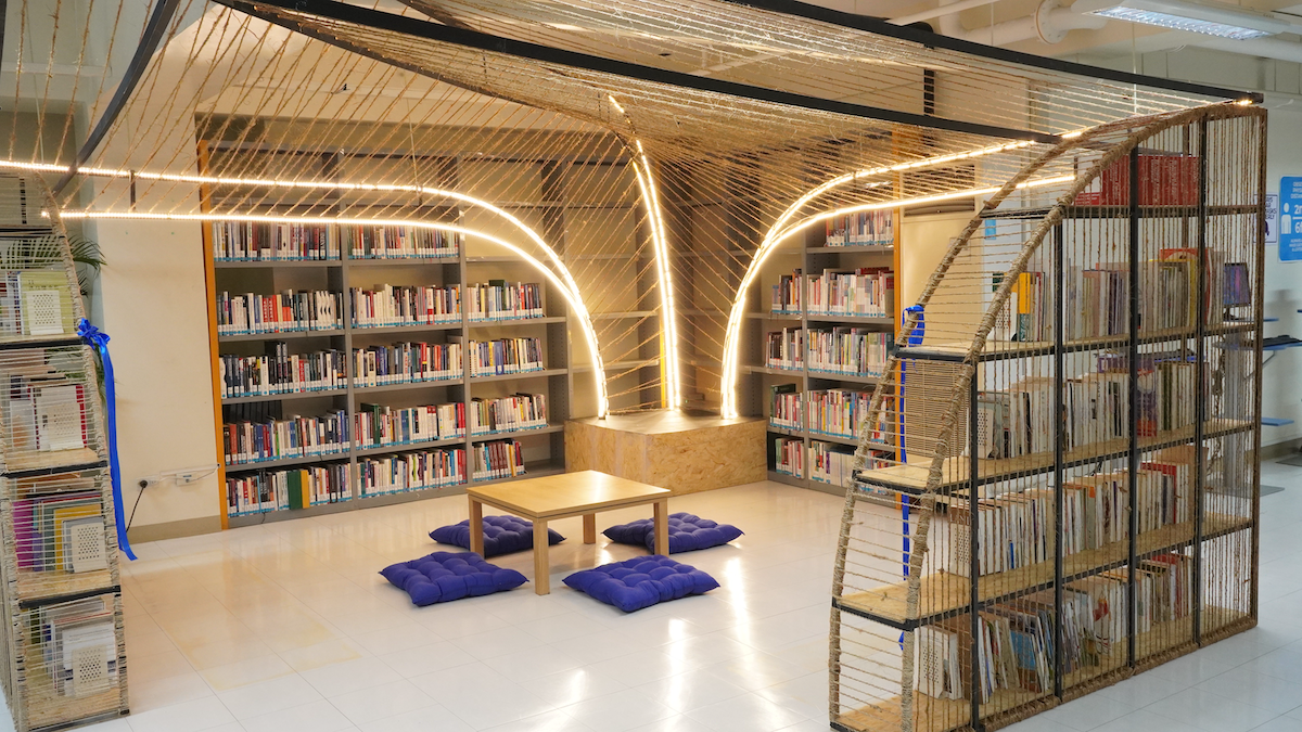 The revamped Window on Korea collection expanded that corner into a special nook with floor seating under a custom lighting installation with built-in shelving.