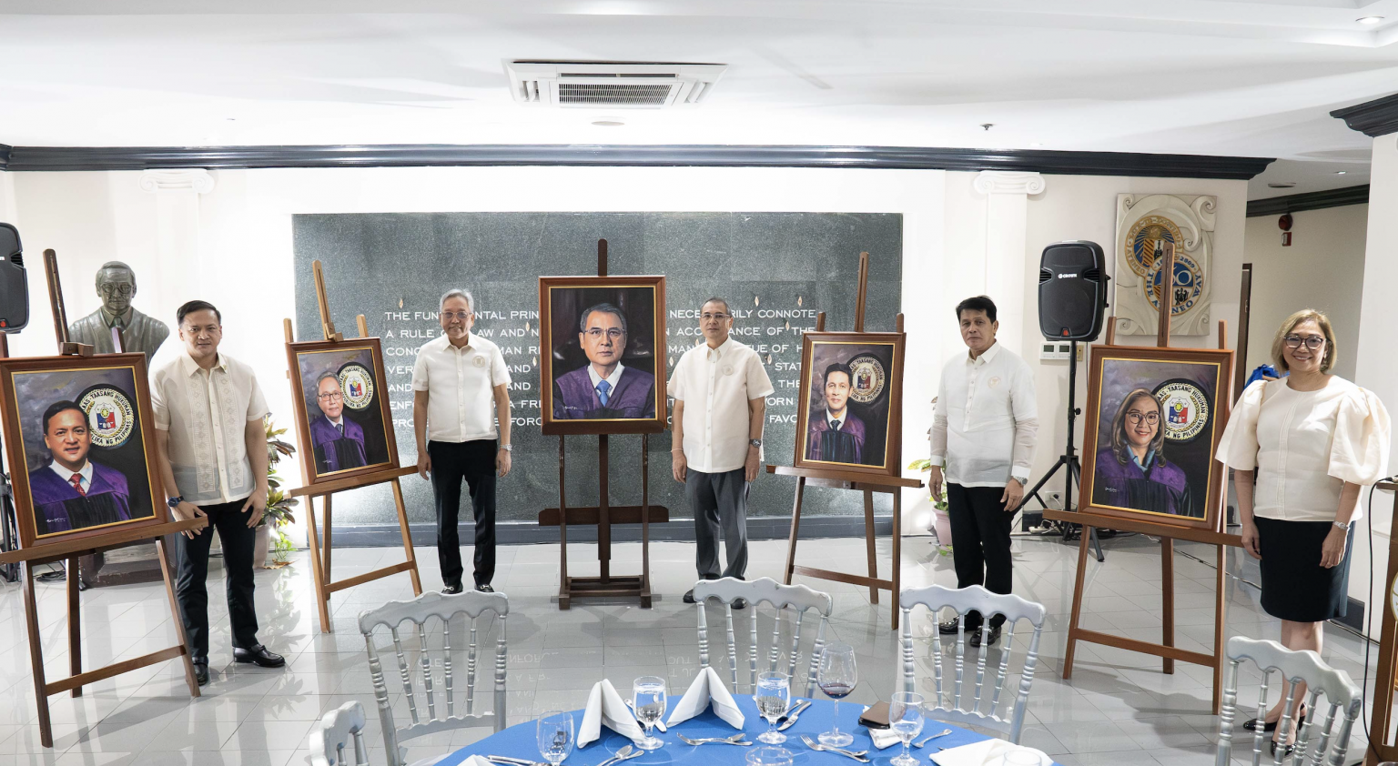 Chief Justice Alexander G Gesmundo (center) and (from left) Associate Justices Jose Midas P Marquez, Rodil V Zalameda, Ricardo R Rosario, and Maria Filomena D Singh pose beside their respective portraits as Ateneo Law alumni Members of the Supreme Court at the Teehankee Hall of the Ateneo Rockwell Campus in Rockwell Center, Makati City on 17 May 2024. (Courtesy of the Supreme Court Public Information Office)