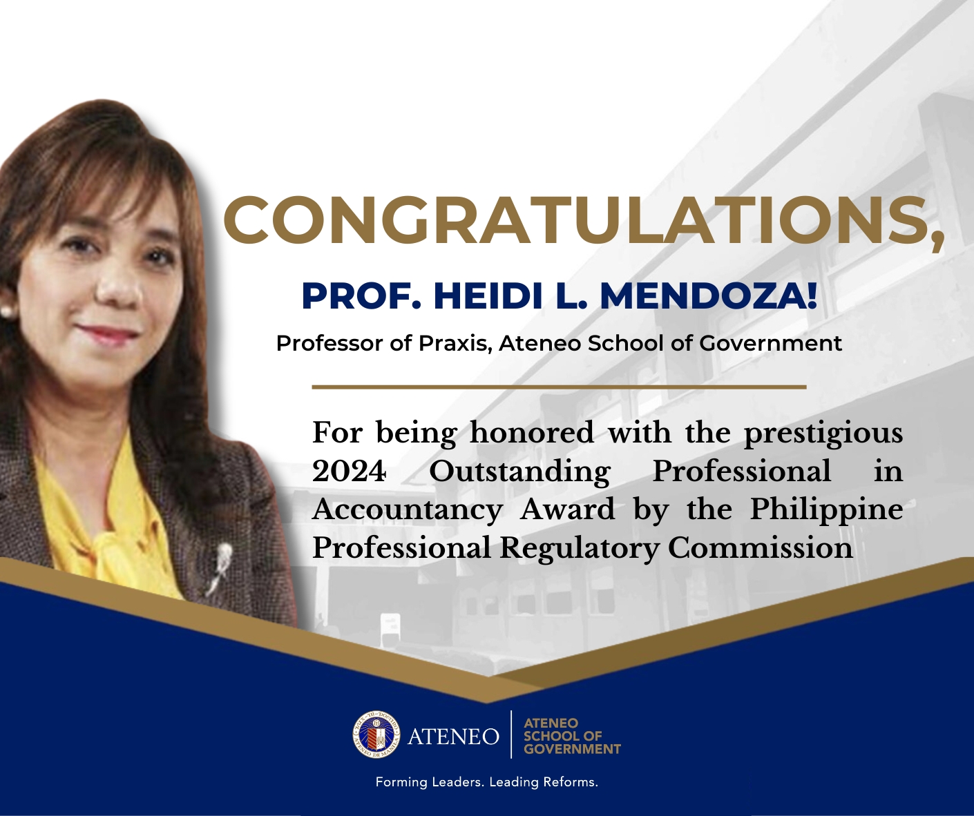 We are delighted to announce that Heidi Mendoza, Professor of Praxis at the Ateneo School of Government, has been honored with the prestigious 2024 Outstanding Professional in Accountancy award by the Professional Regulation Commission. This award recognizes her exceptional contributions to the field of accountancy and her unwavering commitment to advancing the profession in the Philippines.