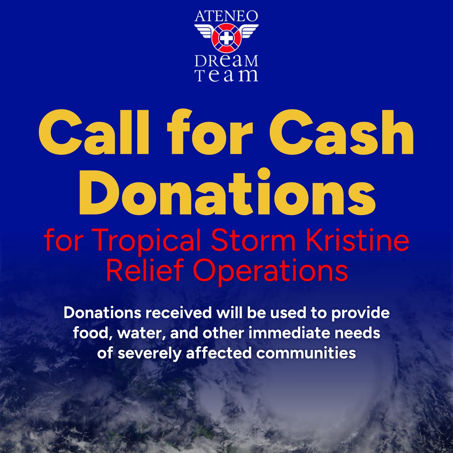 The Ateneo Dream Team appeals to your kindness and generosity to help the families and communities severely affected by Tropical Storm Kristine. Your cash donations enable us to respond more quickly and efficiently.