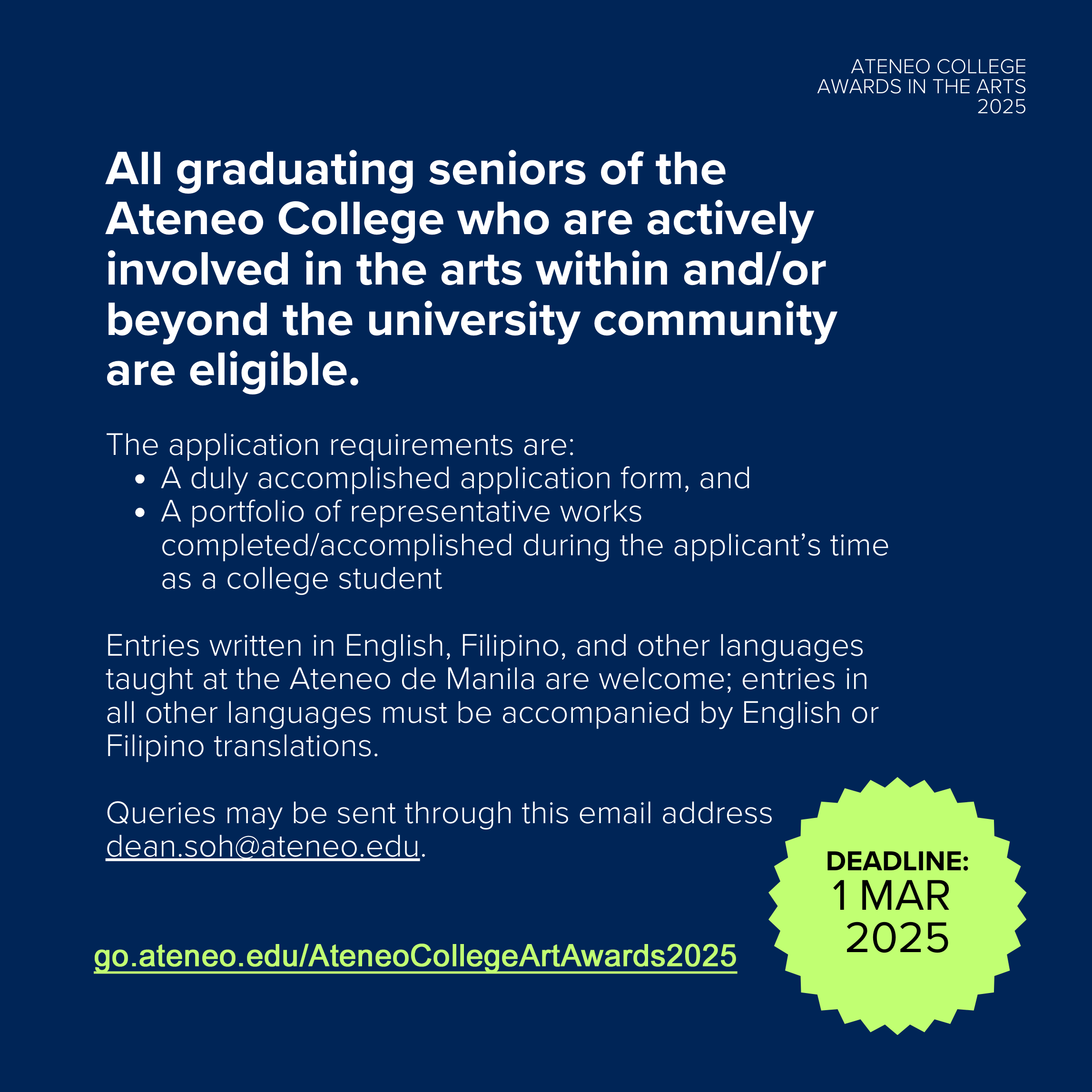 Applications are now being accepted for the Ateneo College Awards in the Arts 2025! Visit https://go.ateneo.edu/AteneoCollegeArtAwards2025 or scan the QR code for more details and to submit your application.