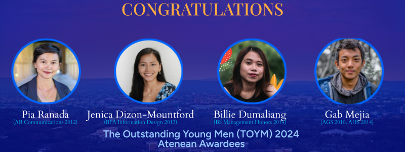 Four Ateneo de Manila University alumni have been recognized as part of the 2024 batch of The Outstanding Young Men. The Ateneo TOYM Awardees are, Pia Ranada (AB Communications 2012), Jenica Dizon-Mountford (BFA Information Design 2013), Billie Dumaliang (BS Management Honors 2014), and Gab Mejia (AGS 2010 and AHS 2014).