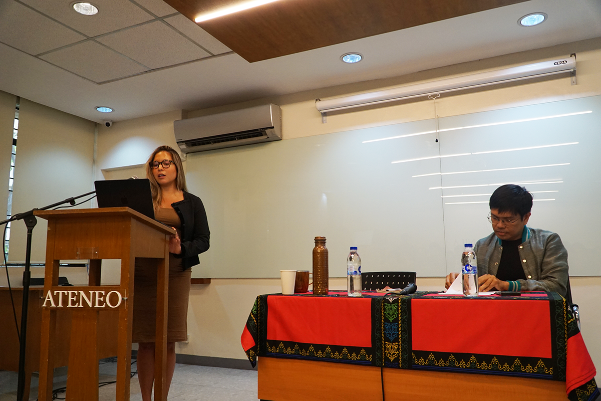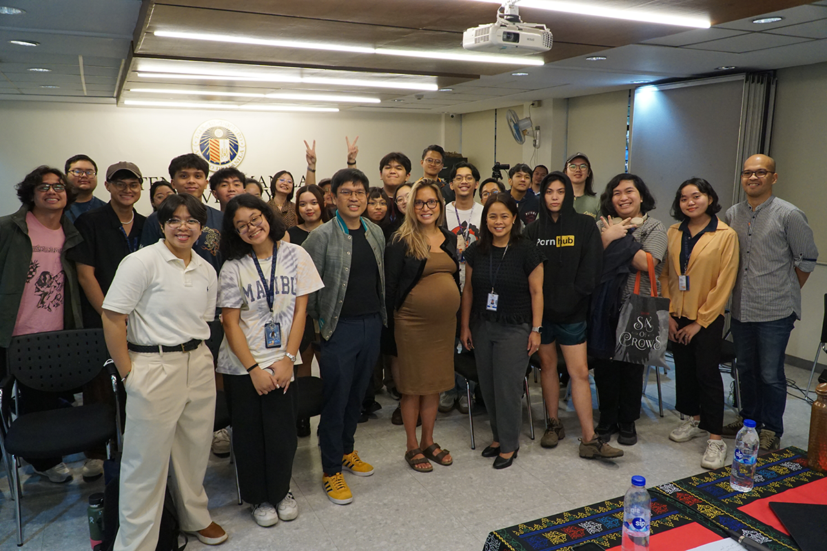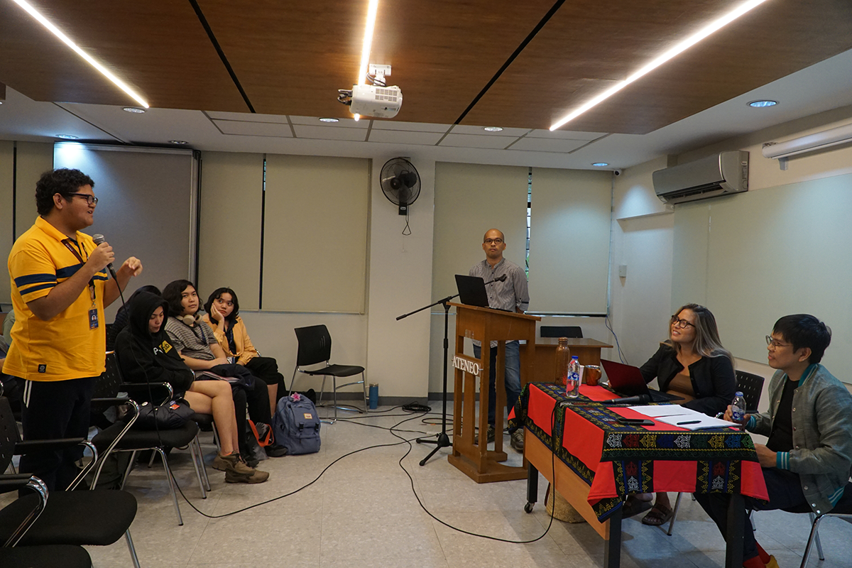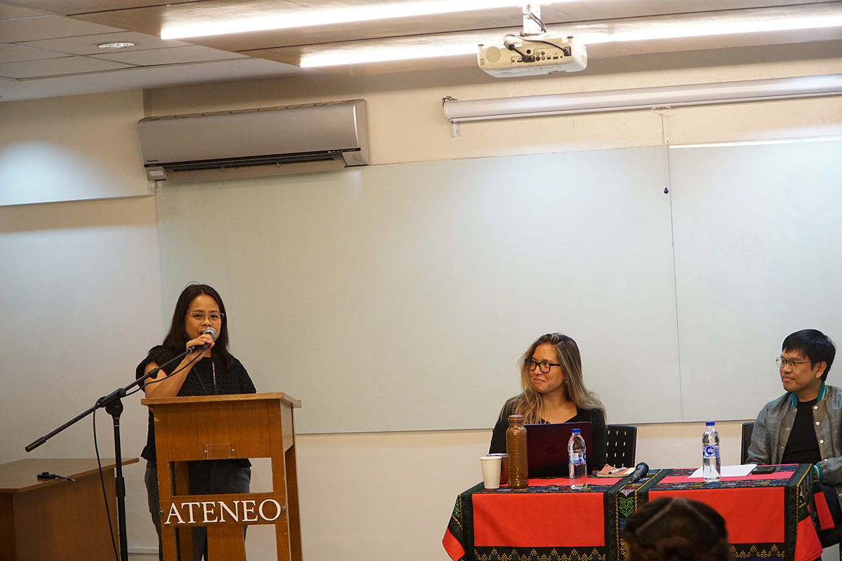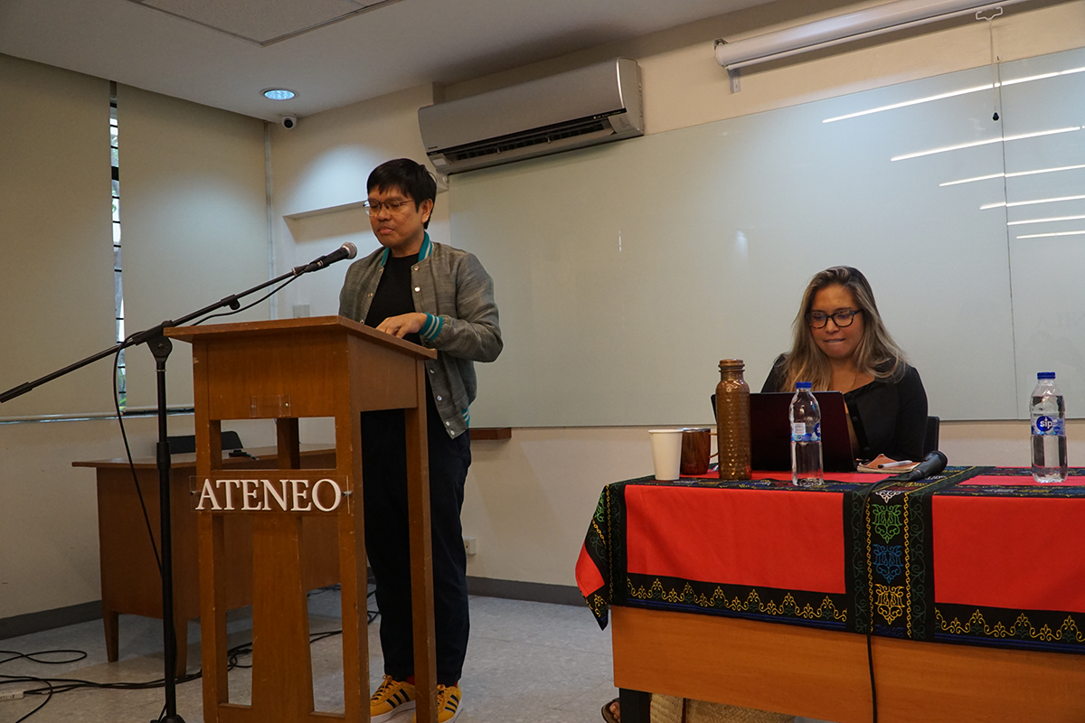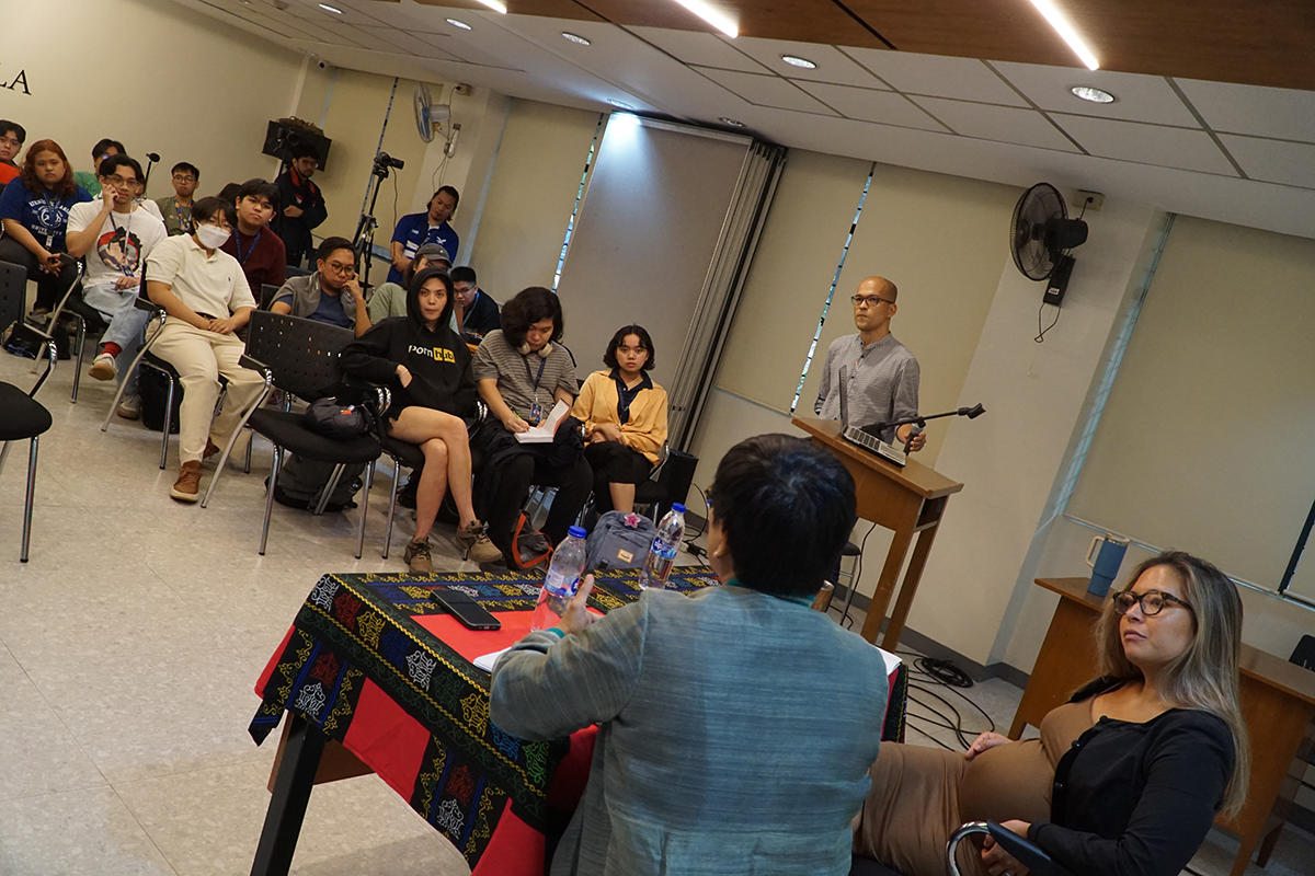 The lecture began with some welcoming remarks from Dr Patricia Lambino, Dean of the School of Humanities. Here, Dr Lambino commended Exploding Galaxies for being an "industry partner" of the school, both as a place where SOH graduates can practice their craft and as an institution helping preserve Filipino literary classics.
