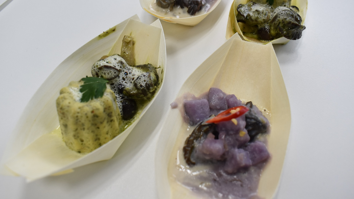 Two different takes on snails, one simmered in coconut milk, the other sautéed in garlic butter cream sauce with parsley and parmesan flan.