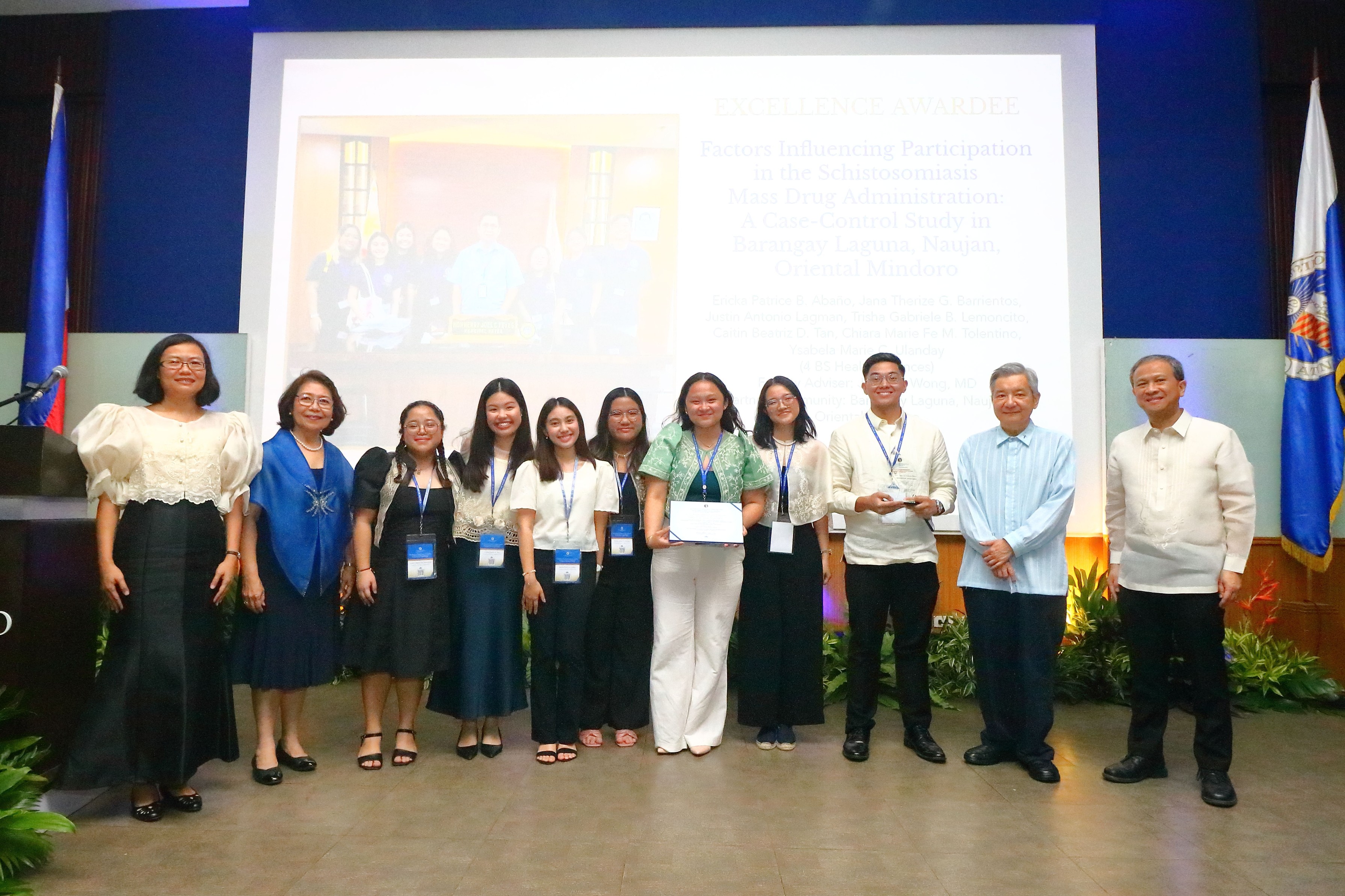This year’s ASCEND Excellence Award for College Thesis Group Research was awarded to fourth-year BS Health Sciences students composed of Ericka Patrice B Abaño, Jana Therize G Barrientos, Justin Antonio Lagman, Trisha Gabriele B Lemoncito, Caitin Beatriz D Tan, Chiara Marie Fe M Tolentino, and Ysabela Marie C Ulanday, for their research entitled, “Factors Influencing Participation in the Schistosomiasis Mass Drug Administration: A Case-Control Study in Barangay Laguna, Naujan, Oriental Mindoro”.