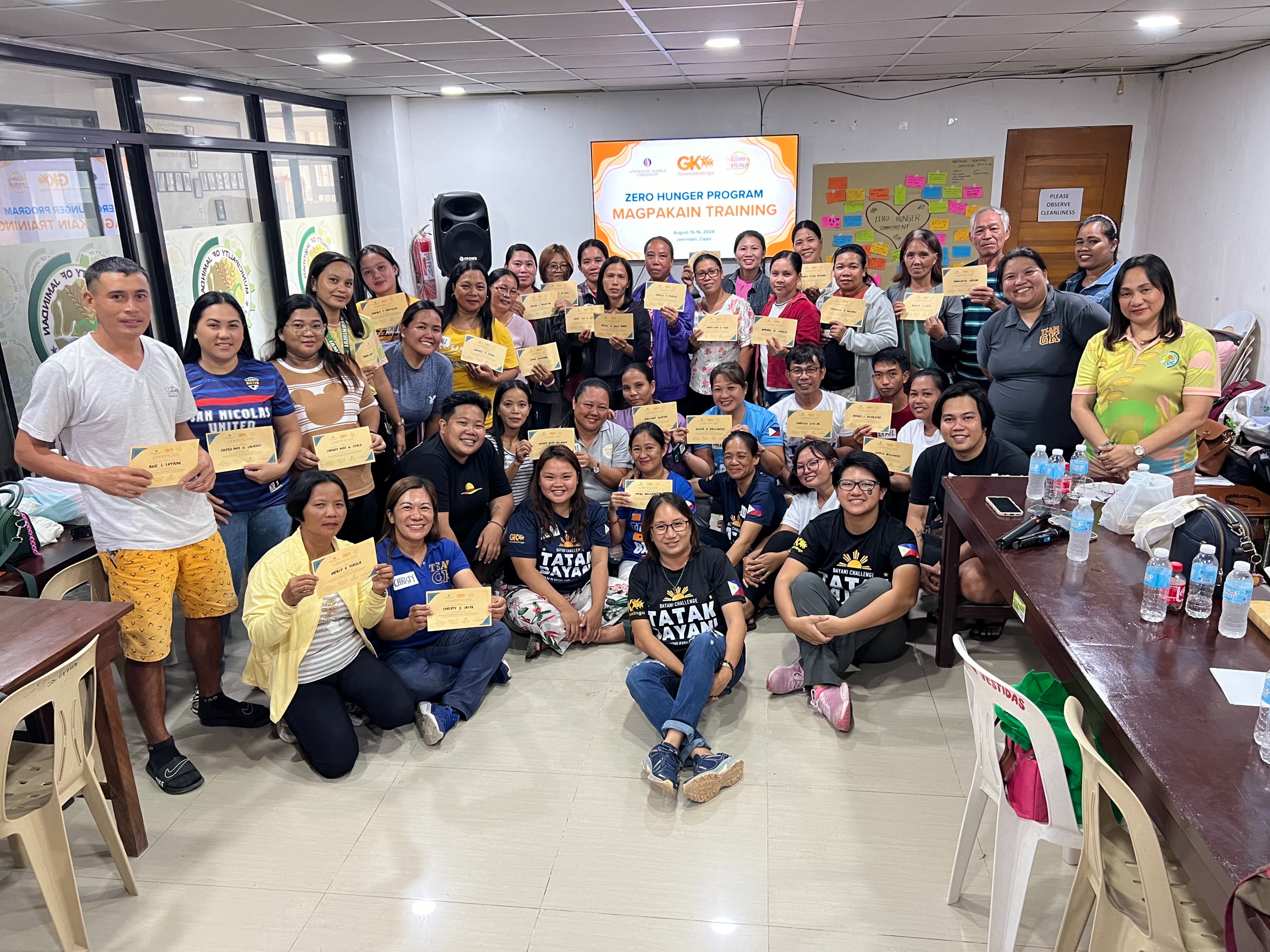 Last 15-16 August 2024, Gawad Kalinga–Ateneo (GKA) conducted a two-day Magpakain Training in Jamindan, Capiz to strengthen the local implementation of the Kusina ng Kalinga (KnK) program. The training was held in partnership with the Gawad Kalinga Institute (GKI), the Local Government Unit of Jamindan (LGU Jamindan), the GK Western Visayas Team, and the GK Capiz Provincial Management Team (PMT). A total of 41 participants joined the training, including parent volunteers from partner schools, representatives from the Capiz PMT, the GK Western Visayas Operations Team, and the Jamindan Municipal Hub.
