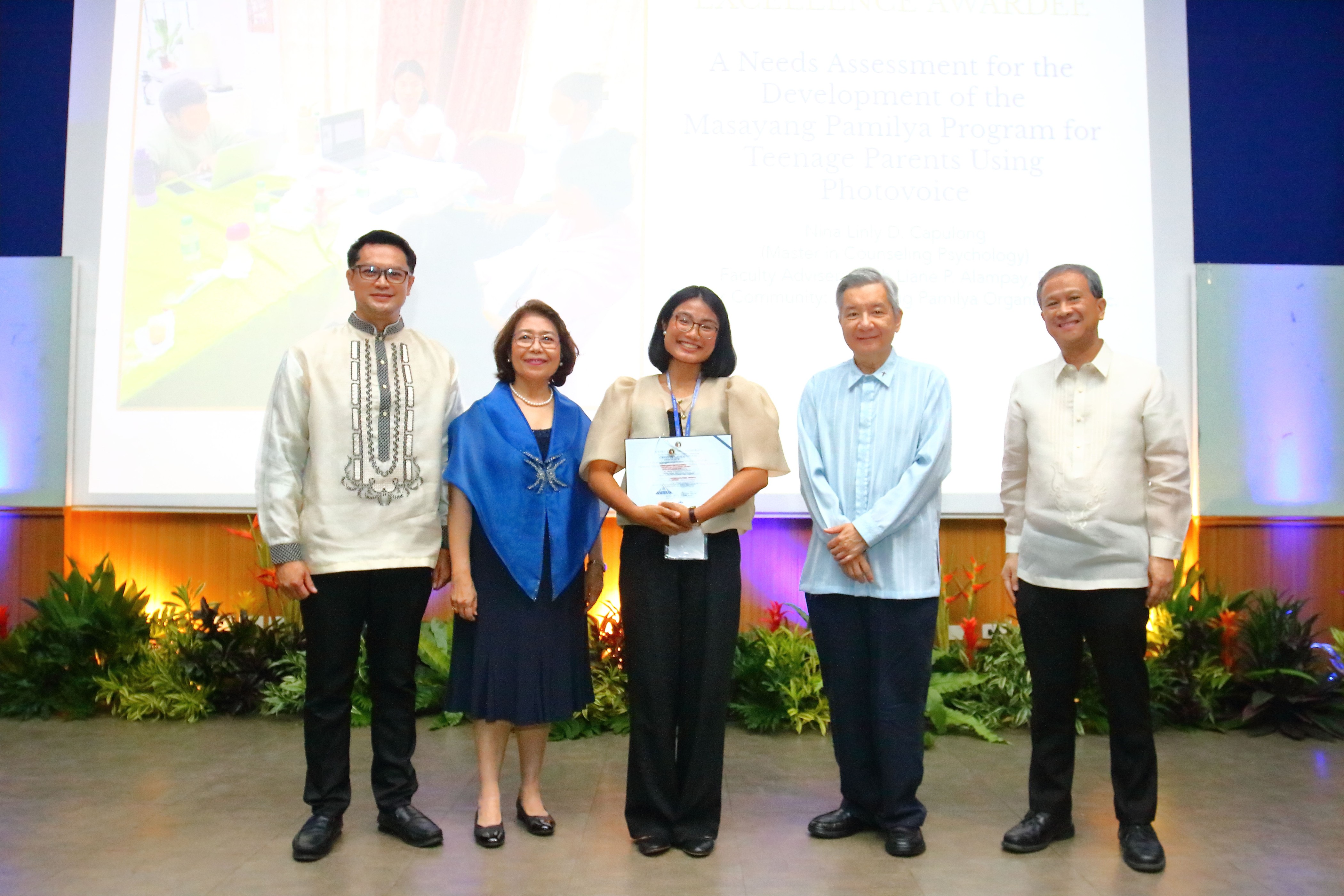 This year’s ASCEND Excellence Award for Postgraduate Thesis Research was awarded to Nina Linly D Capulong, Master in Counseling Psychology student, for her research entitled, “A Needs Assessment for the Development of the Masayang Pamilya Program for Teenage Parents Using Photovoice”.