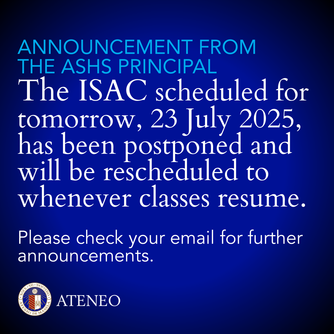 Ateneo de Manila Senior High School's Ignatian Spirituality and Ateneo Culture (ISAC) session originally scheduled for Wednesday, 23 July 2025, will be postponed to whenever classes resume. Those concerned are advised to check their email for further announcements.