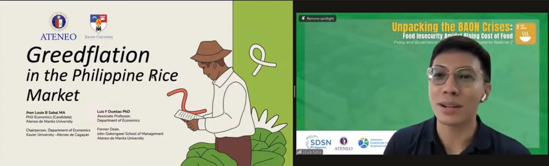 Mr Jhon Louie Sabal, Chairperson of the Department of Economics at Xavier University - Ateneo de Cagayan attributes 63% of rice inflation nationwide to "greedflation," where markups beyond production costs, exacerbated by deregulation and cartel behavior, drive up prices. Mr. Sabal emphasized raising rice costs is a political issue impacting national stability. He urged structural reforms and improved governance to support local producers and consumers.