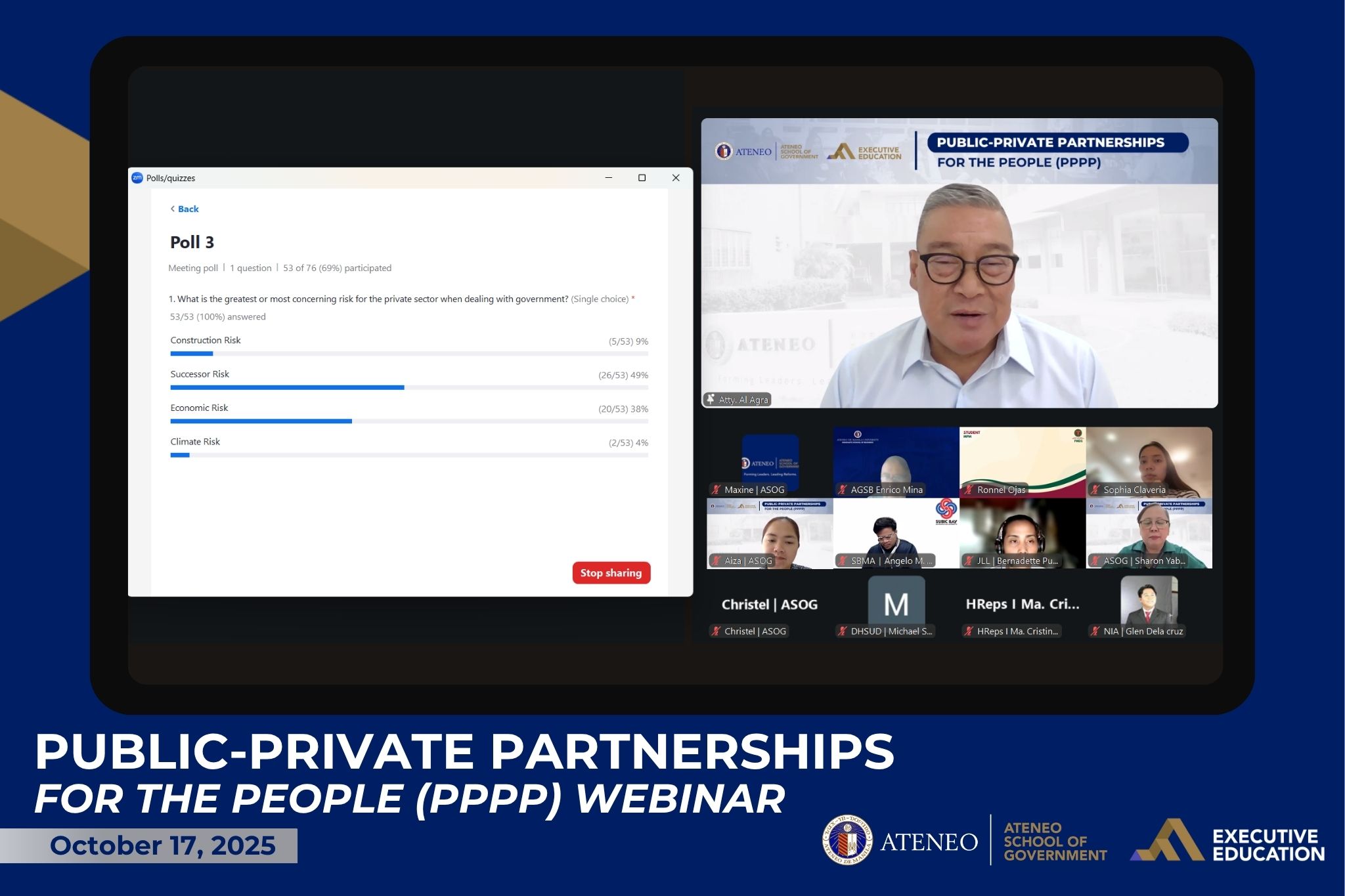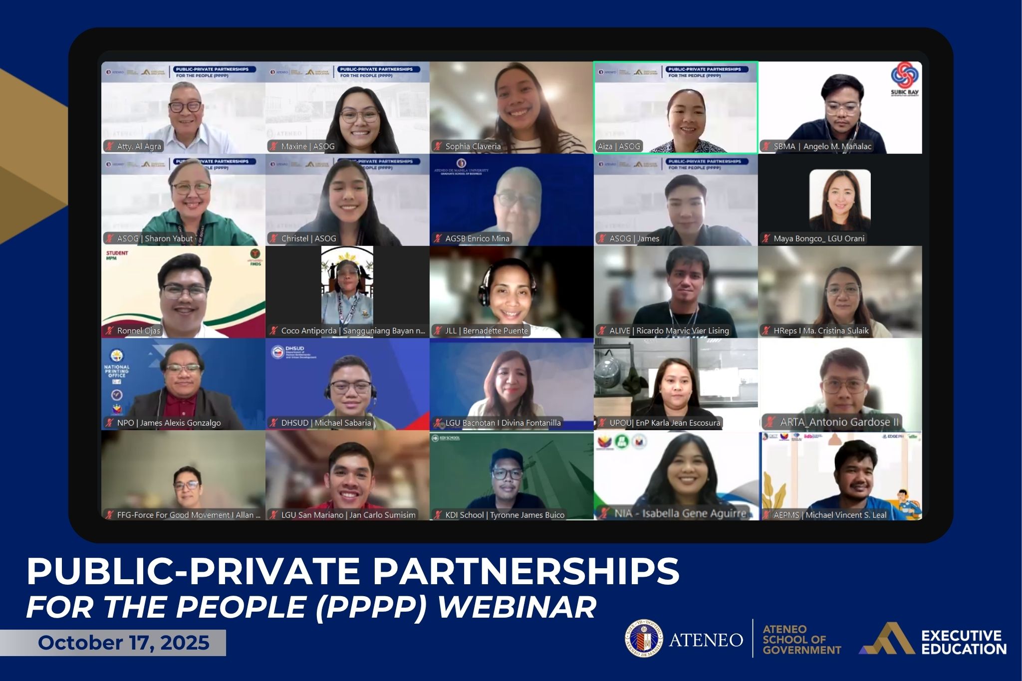 The Ateneo School of Government (ASoG), through its Executive Education Program, held an open webinar on “Public–Private Partnerships for the People (PPPP): Understanding the New PPP Code and Its Implementing Rules and Regulations” on 17 October 2025, via Zoom.