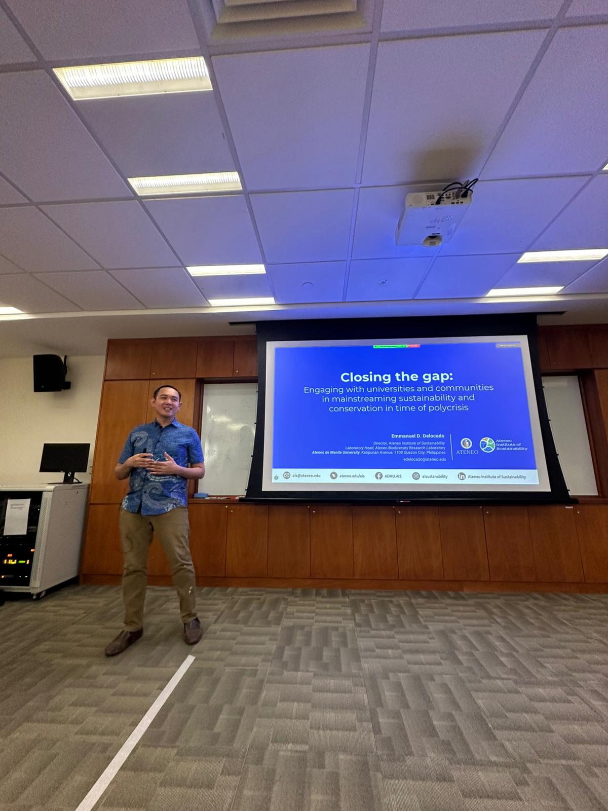 Held last 30 October 2025, the seminar was designed for the MS Biodiversity Conservation and Sustainability students of NUS. In the talk titled “Closing the gap: Engaging with universities and communities in mainstreaming sustainability and conservation in time of polycrisis”, Delocado argued that sustainability and biodiversity advocates are challenged to bridge certain communication gaps between different sectors of the society. His talk featured case studies, culling from his experience in AIS and in BiodivLab, on how to package sustainability and conservation issues relevant and actionable to stakeholders.